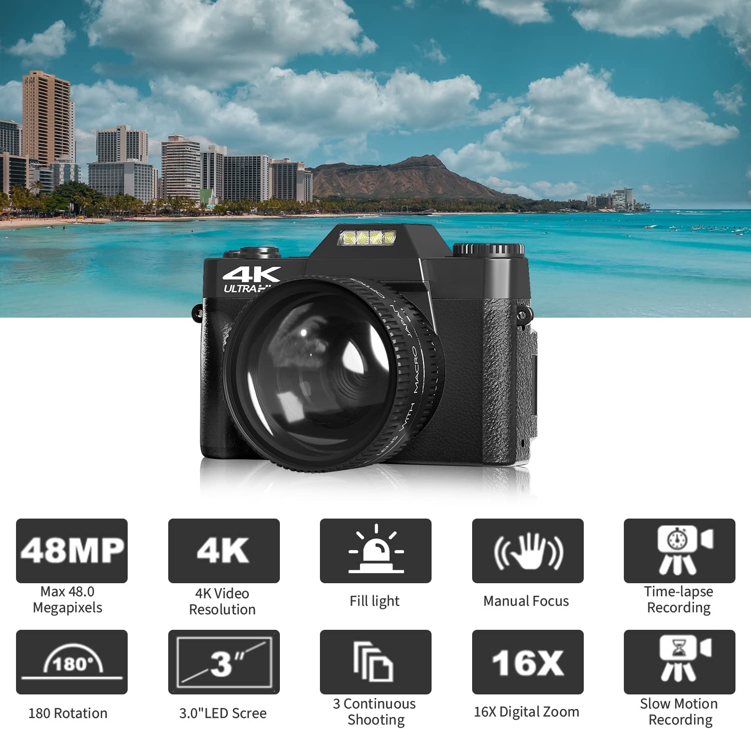 - ?【Camera for Photoggraphy and Video】The digital camera featuring 4K video and 48MP photo resolution, the vlogging camera supports 16X Digital Zoom, Video Pause, Recording while Charging, Loop Recording, Continuous Shooting, Silent Recording, Self-Timer. with the latest upgraded chip to ensure the camcorder images more high-definition, more realistic. It’s the best gift for friends and family.