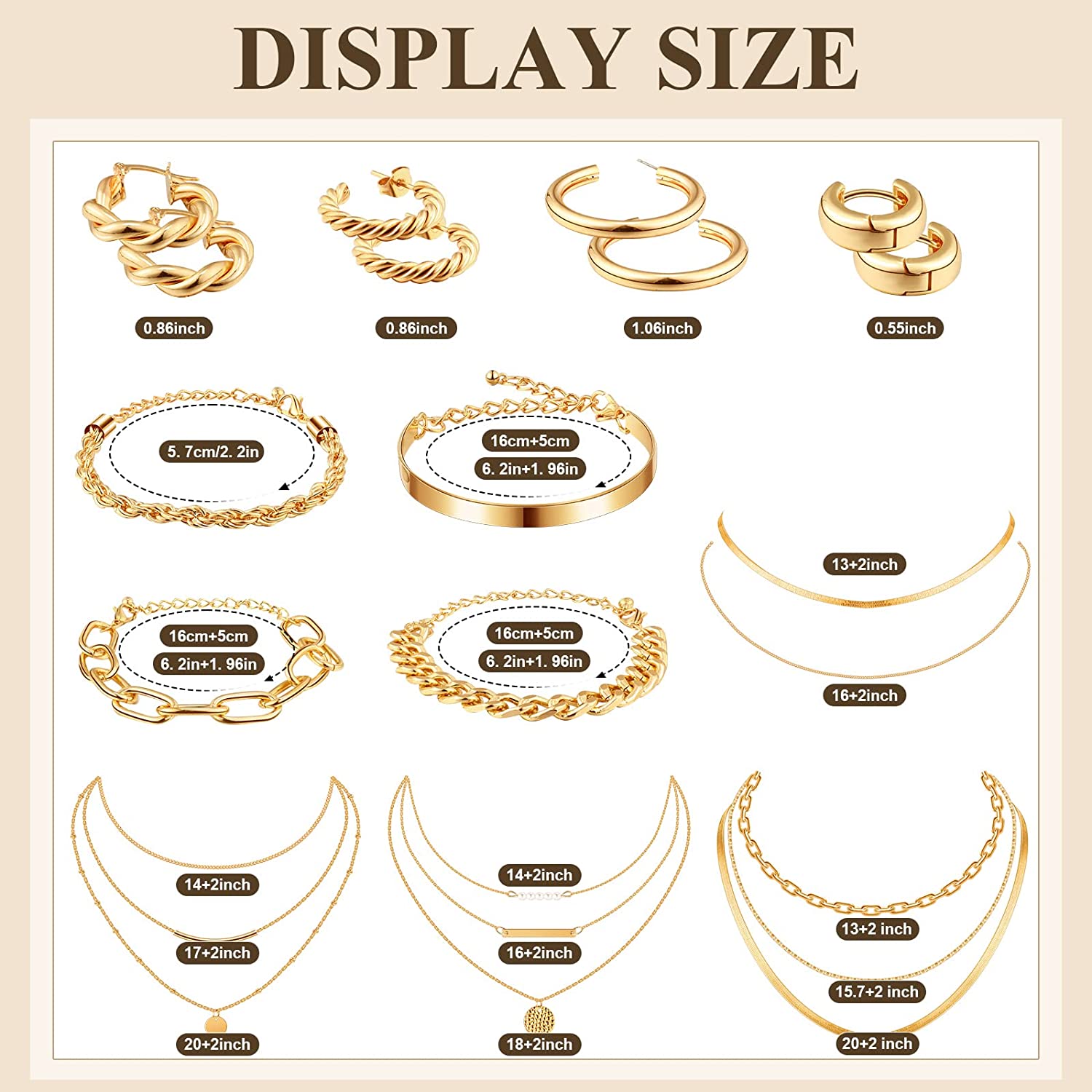 • Multiple Sizes to Choose from: the small gold hoop earrings offer 3 sizes, including about 0.55 inch, 0.79 inch and 0.98 inch; The gold necklaces for women trendy also come in 3 sizes, namely about 13 inches + 2 inches extension, 15.7 inches + 2 inches extension, and 20 inches + 2 inches extension, adjustable to fit most women and girls; The stackable bracelets for women area about 6.2 inches + 1.96 inches extension, easy to put on or take off