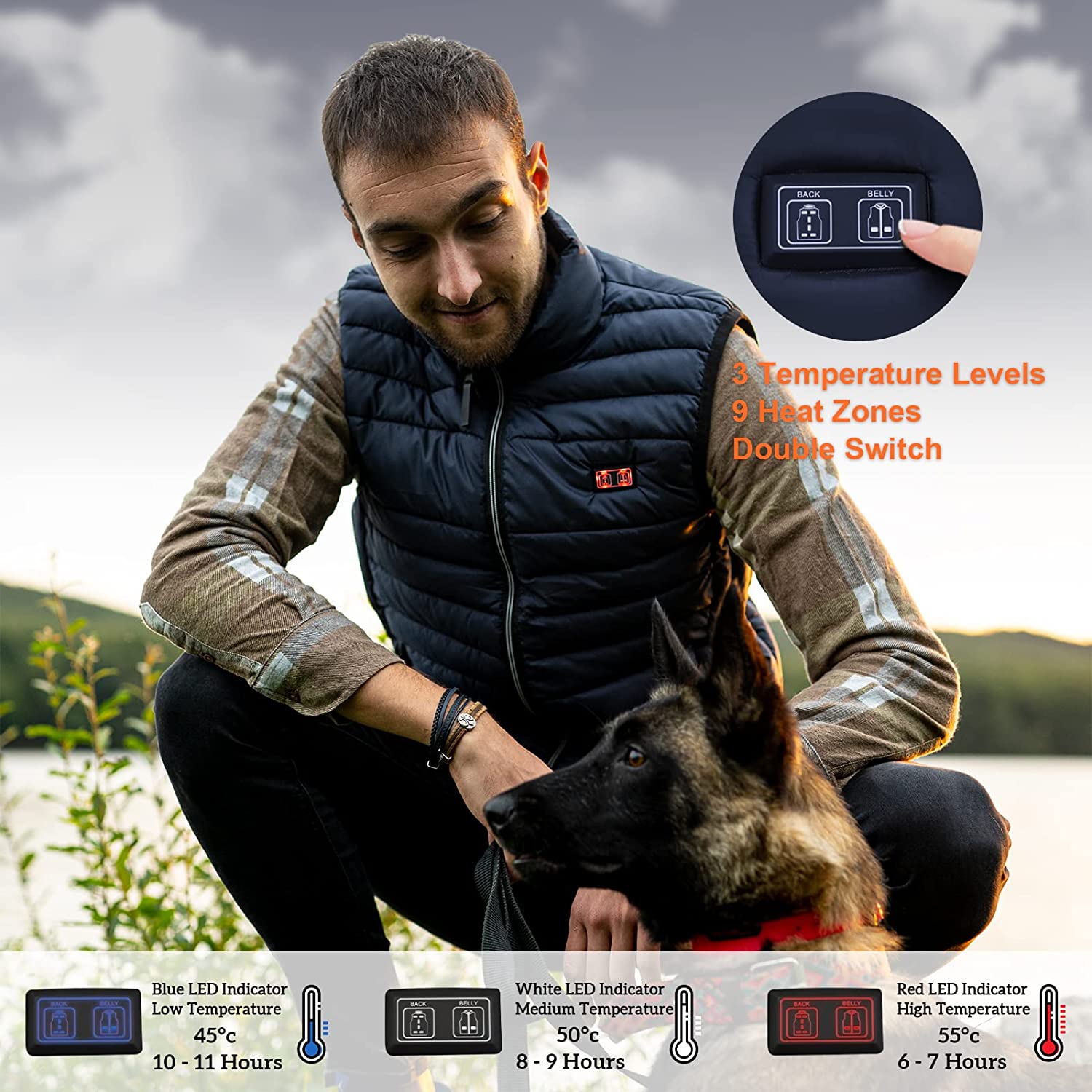 - 9 Heating Zones-The heated vests for men have 9 heating zones, which are Abdomen*2, Mid Back*2, Collar*1, Shoulder*2, Waist*2, the front and back heating zones are independently controlled by two switches. The heating zones are just right to warm up your core and hands in the pockets and the back zone is big enough to cover most of your back, enough warmer. The effective heat therapy to promote blood circulation, great for pain relief, relieve the discomfort of rheumatism & muscles.
