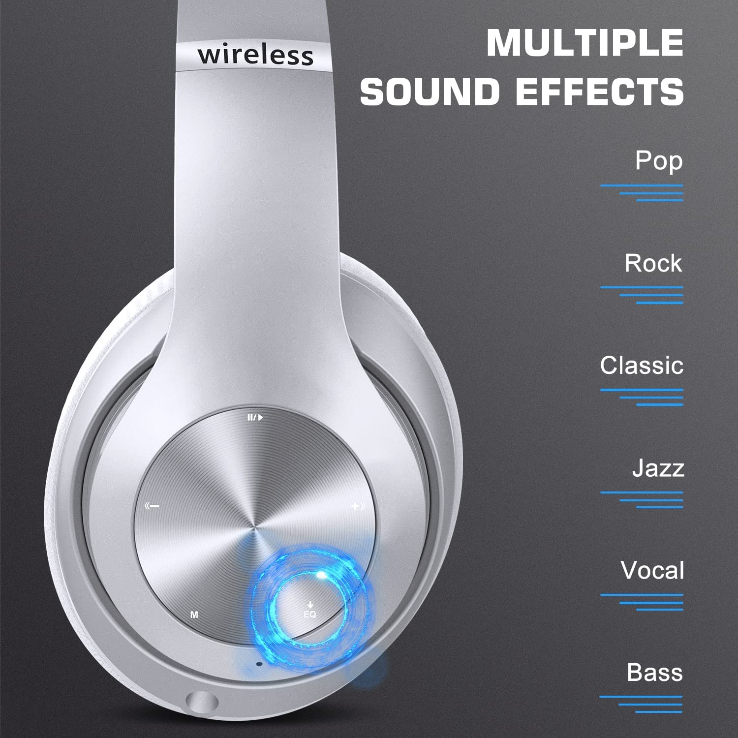 【HIFI STEREO & 6 EQ MODE】Our Bluetooth headphones over ear deliver High Fidelity Stereo sound results from dual 40mm drivers and ear cushion design, which both combining provide superior immersive HiFi sound quality. With 6 EQ modes, which make you can freely switch between Bass/Jazz/Voice/Rock/Pop/Classic sounds, each mode provides you with the CD quality sound.