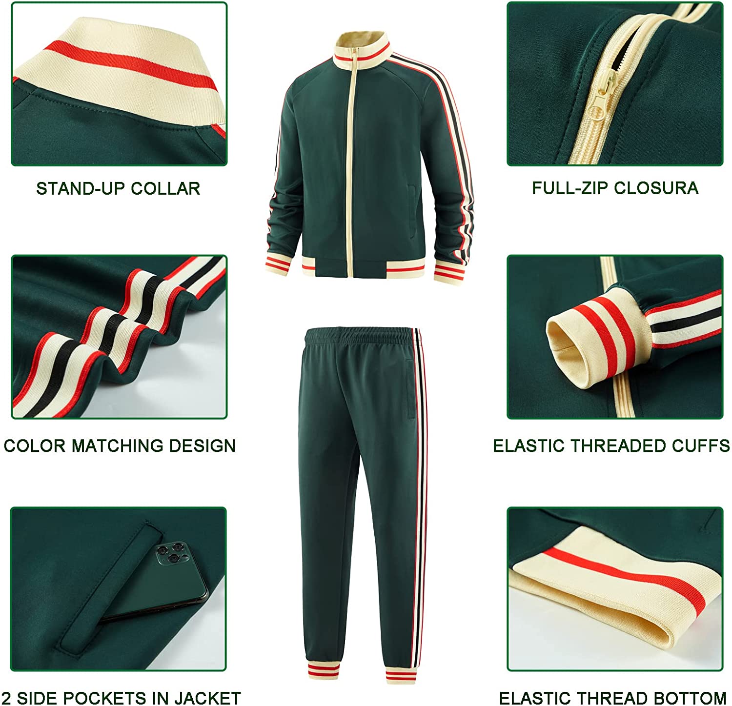 Tracksuit men has a relaxed fit preventing any bunching or tightness; full-zip front offers easy on-and-off, pockets on both track jackets and pants, convenient for you to bring small things with you, like keys, phone