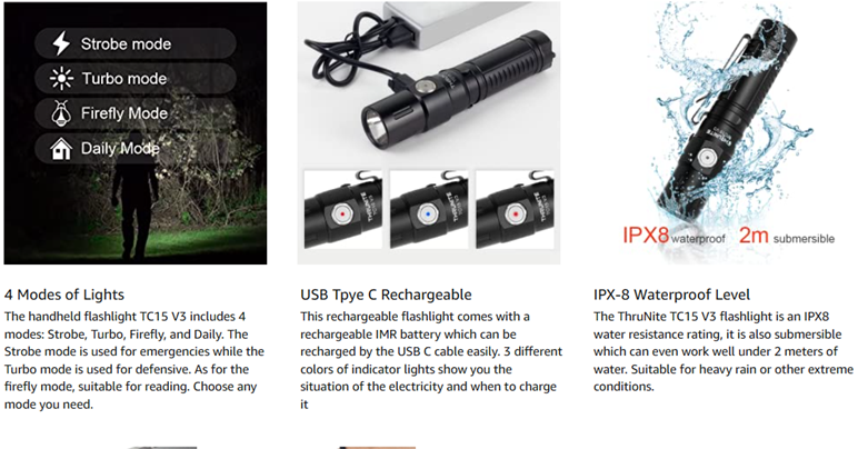The excellent ThruNite TC15 V3 provides you with a wonderful experience. This handheld flashlight adopts the newest CREE XPH35.2 LED and ThruNite IMR battery. Not only a handheld LED flashlight, but also an EDC flashlight which can be used indoors & outdoors, such as hiking, camping, security or in an emergency.