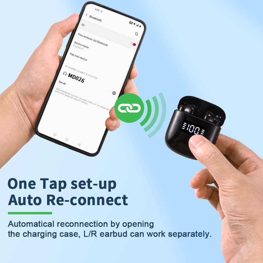 • USB-C Fast Charge and LED Power Display: With UCB-C quick charge, it only takes 1hr to charge the changing case. The bluetooth earbud can last 5 hours playtime from a single charge and provides extra 20 hours playtime with charging case. The digital portion of the LED screen indicates the percentage of how much the real-time battery has left of the charging case. You can precisely control the power status of the charging box. (Note: Please fully charge it for the first use.)