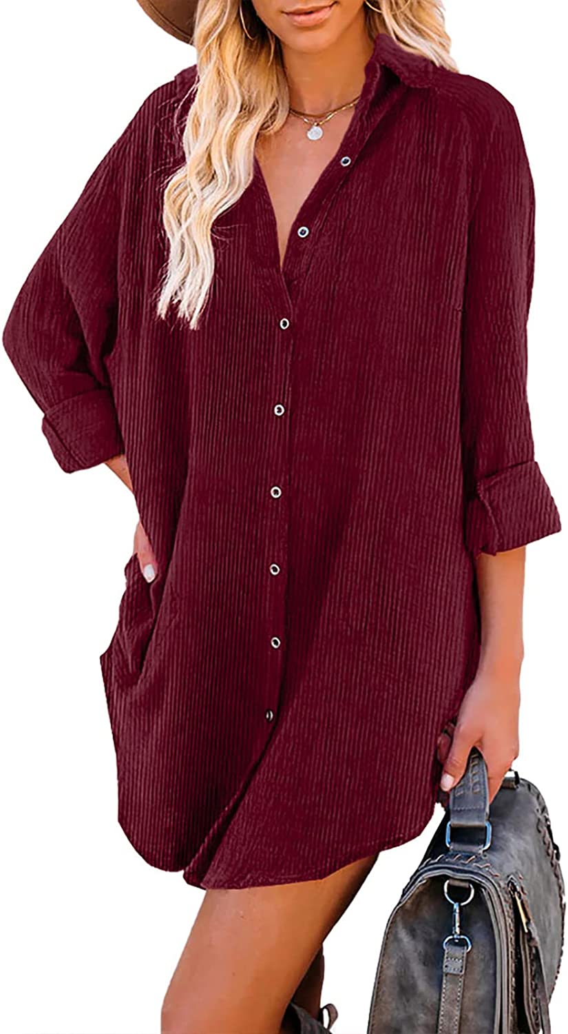 Fashion Design: Long Sleeve, Button, V Neck, Solid Color, Oversized Corduroy Shirt Dress.