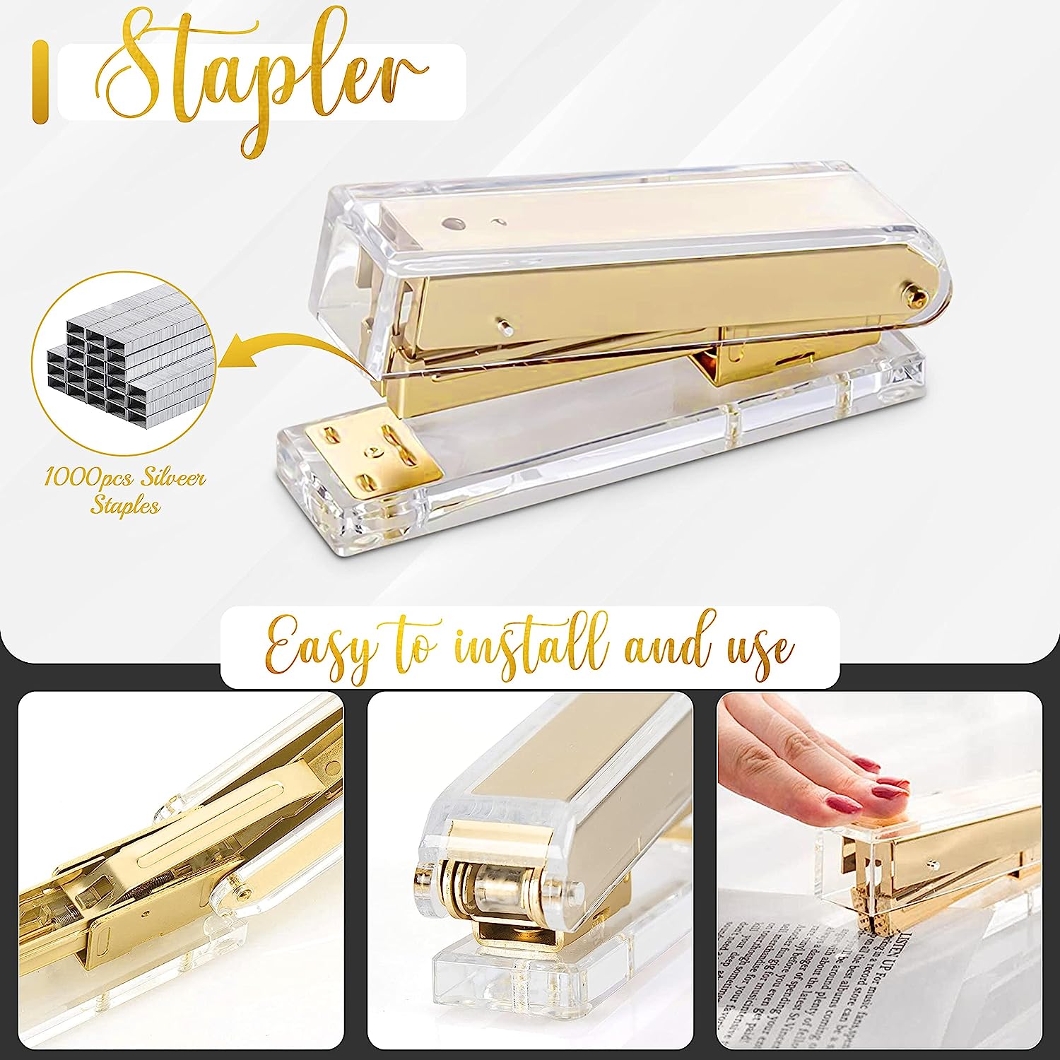 Varuni- Gold Desk Accessories- Office Accessories -Gift Set- Heavy Duty Stapler, Pen Organizer, Tape Dispenser Desk, Clear Sticky Notes- Including Clear Tape and 1000 Staples- Acrylic Desk