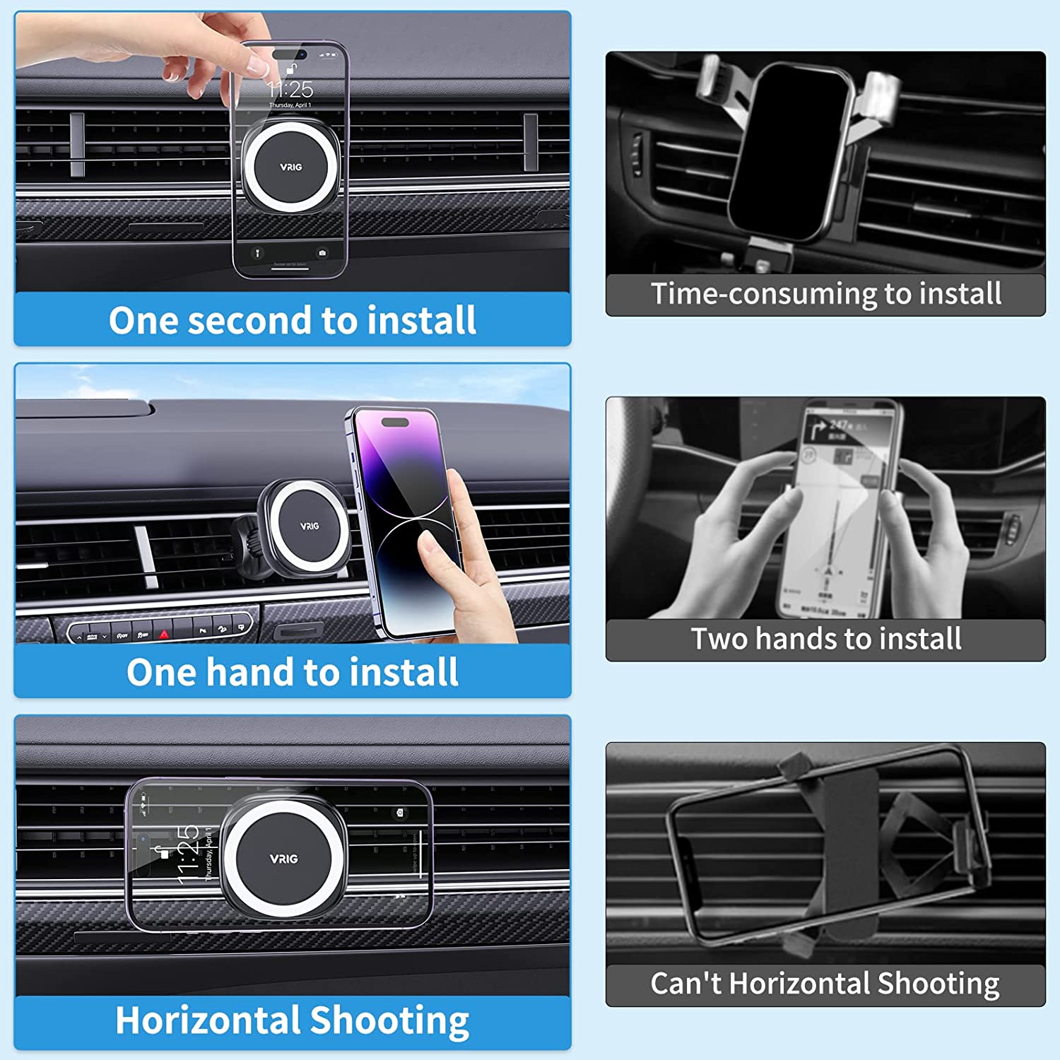 ?LOCK YOUR PHONE FIRMLY: VRIG Magnetic Phone Car Mount with 6 built-in strong magnets, the maximum bearing up to weight of 4 cellphones. Powerful suction keep your cellphone stay stably even when drive on a bumpy road. PLEASE NOTE:1. It is recommend that use the “VRIG round pad” on the back of your phone/case. It is more stable than the square. 2. “VRIG round pad”,Applicable to all mobile phones, super powerful, making mobile phones more stable