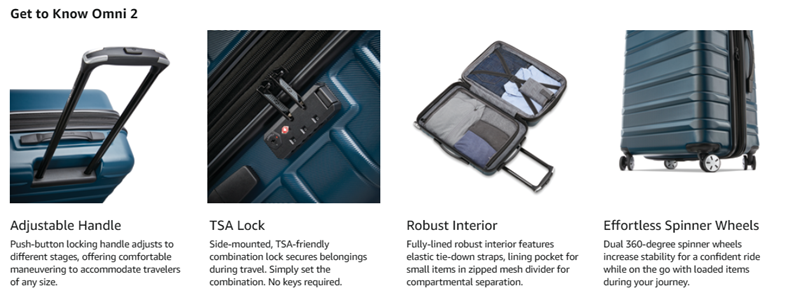 Omni 2 combines scratch-resistant textures with lightweight 100% polycarbonate construction, ensuring your luggage looks as great on the 100th trip as it does on the first. This lightweight line offers heavyweight protection riding on effortless 360° Spinner Wheels. Don’t pull your case; let Omni roll comfortably beside you on your journey. Design includes expansion for added capacity when needed. TSA locks help to protect your belongings.