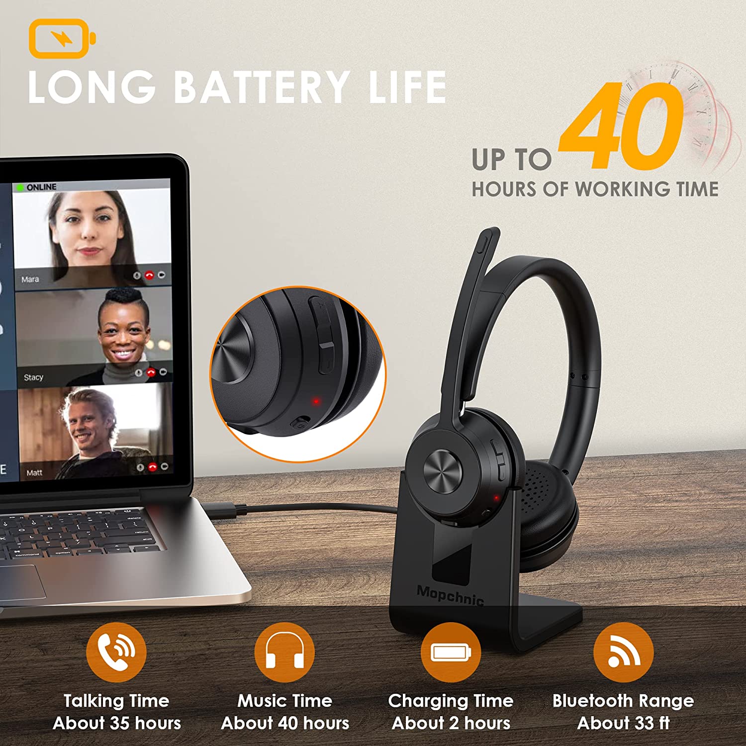 • 【Long Battery Life & Exclusive Charging Base】Our wireless headset is equipped with a 600mAh battery, which provides over 37 hours working time and 230 hours standby time after fully charged. Fully charged only need about 2 hours. Besides, the Bluetooth headset comes with a charging stand, you can put the headset on it to charge. NOTE: Please turn off the headset before charging the headset.