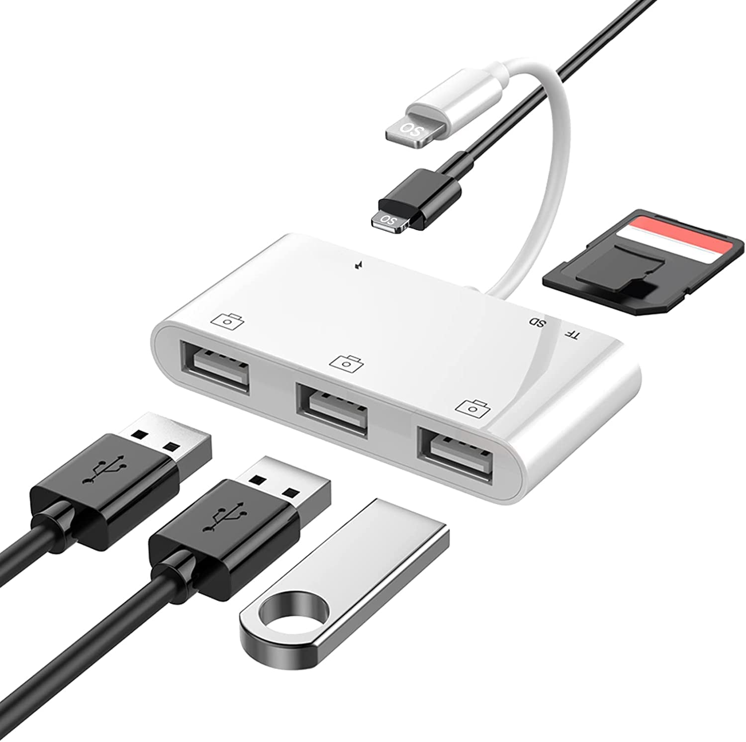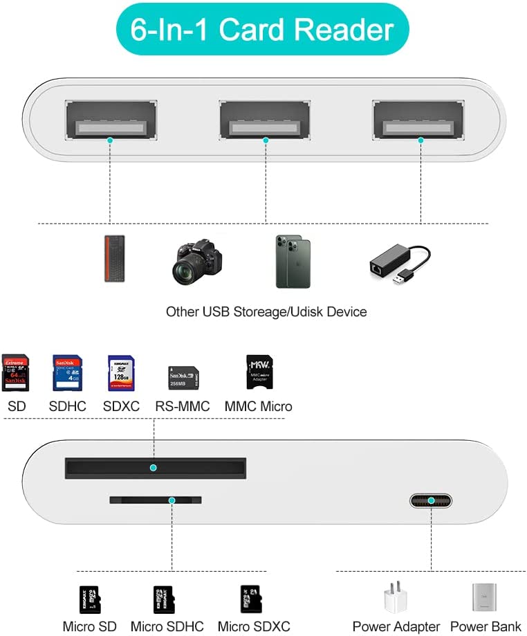 【6-in-1 USB Adapter for iPhone/iPad】♦ This 6 in 1 Camera Memory Reader is designed with Standard SD and TF card slot, 3 Camera Memory Reader and Charging Port. Help you transfer photos and videos from your high-resolution digital camera to your social software by inserting SD/TF card or connecting your camera USB cable directly with your iPhone/iPad.