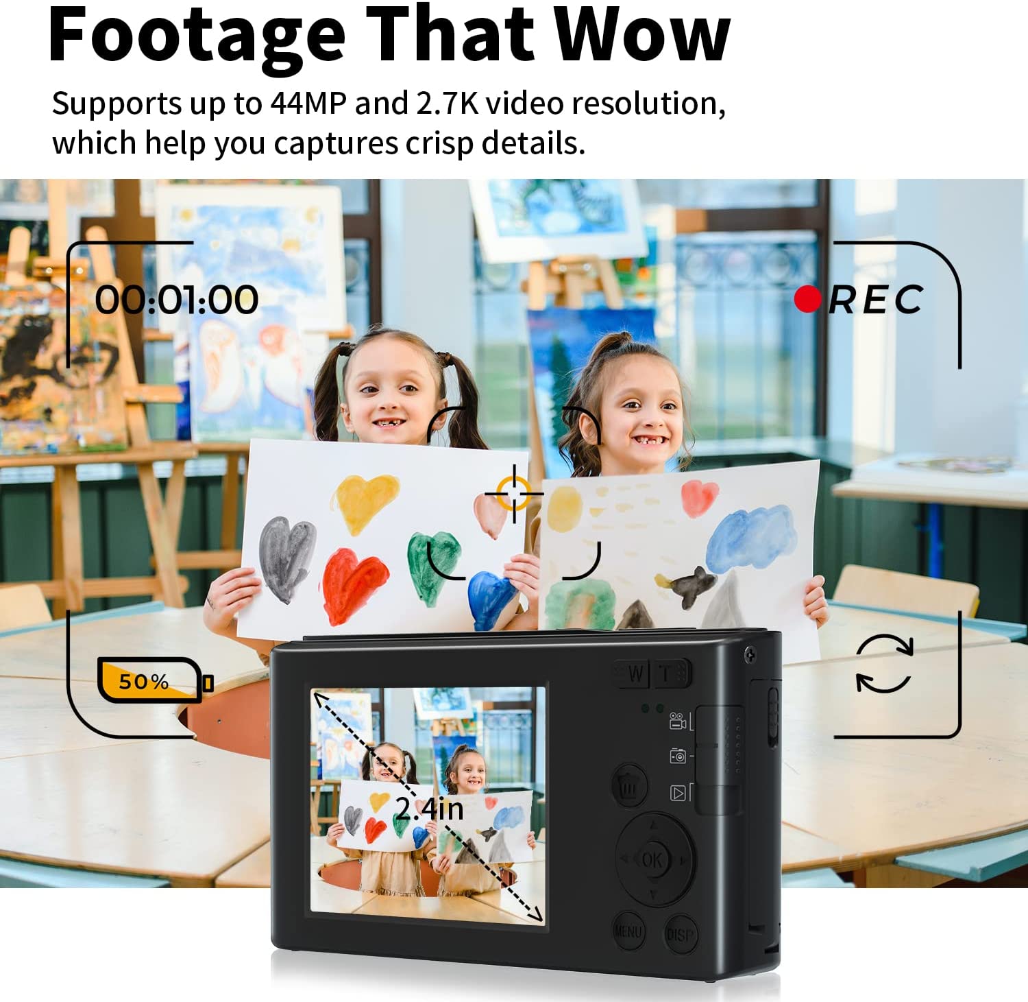 Digital Camera for Kids Teens Boys Girls Adults 4K 44MP with 32GB SD Card, 2.4 Inch Point and Shoot Camera with16X Digital Zoom, Compact Mini Camera Kids Camera for Students Seniors(Black1)