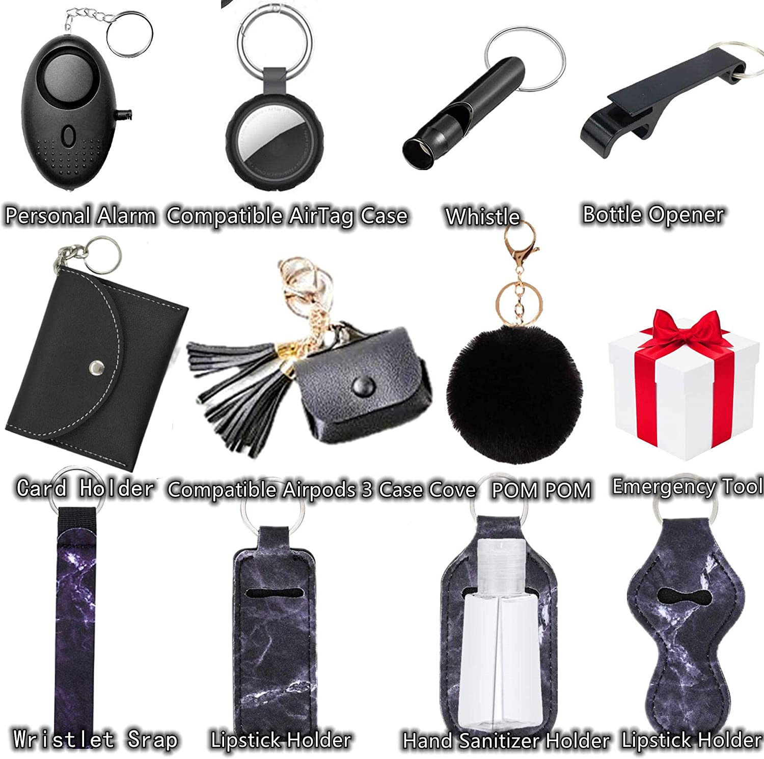 • ⭐【12pcs Safety Keychain Set】: The keychain set value pack consists of?Case Cove Compatible with airtag holder, ? Case Cove Compatible with Apple Airpods pro, ?wristlet, ? personal alarm, ?hand sanitizer bottle holder, ?lipstick holder, ?whistle,?bottle opener, ?card holder and ?pompom.