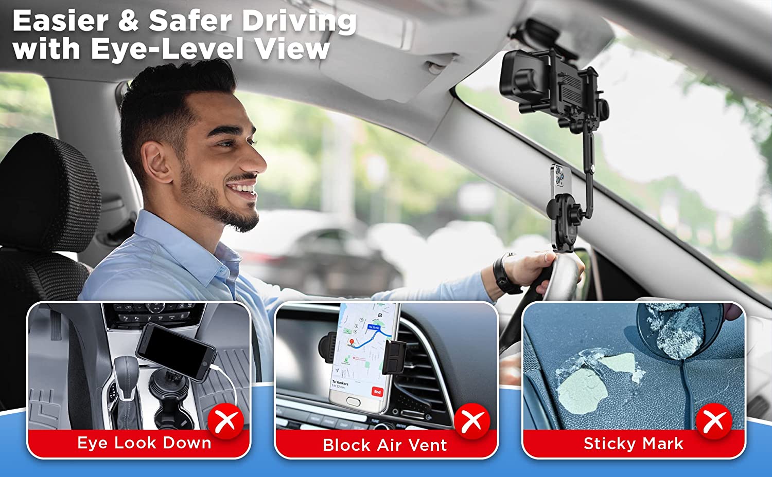 【More Safer Driving】Rear View Mirror Phone Mount Supply Fantastic Line of Sight. No longer looked down at the phone on Cup holders,reducing neck and shoulder pain. Adjust your eyes between the phone and the road in the shortest distance. Comes in handy during tricky city driving to enjoy a better driving experience.