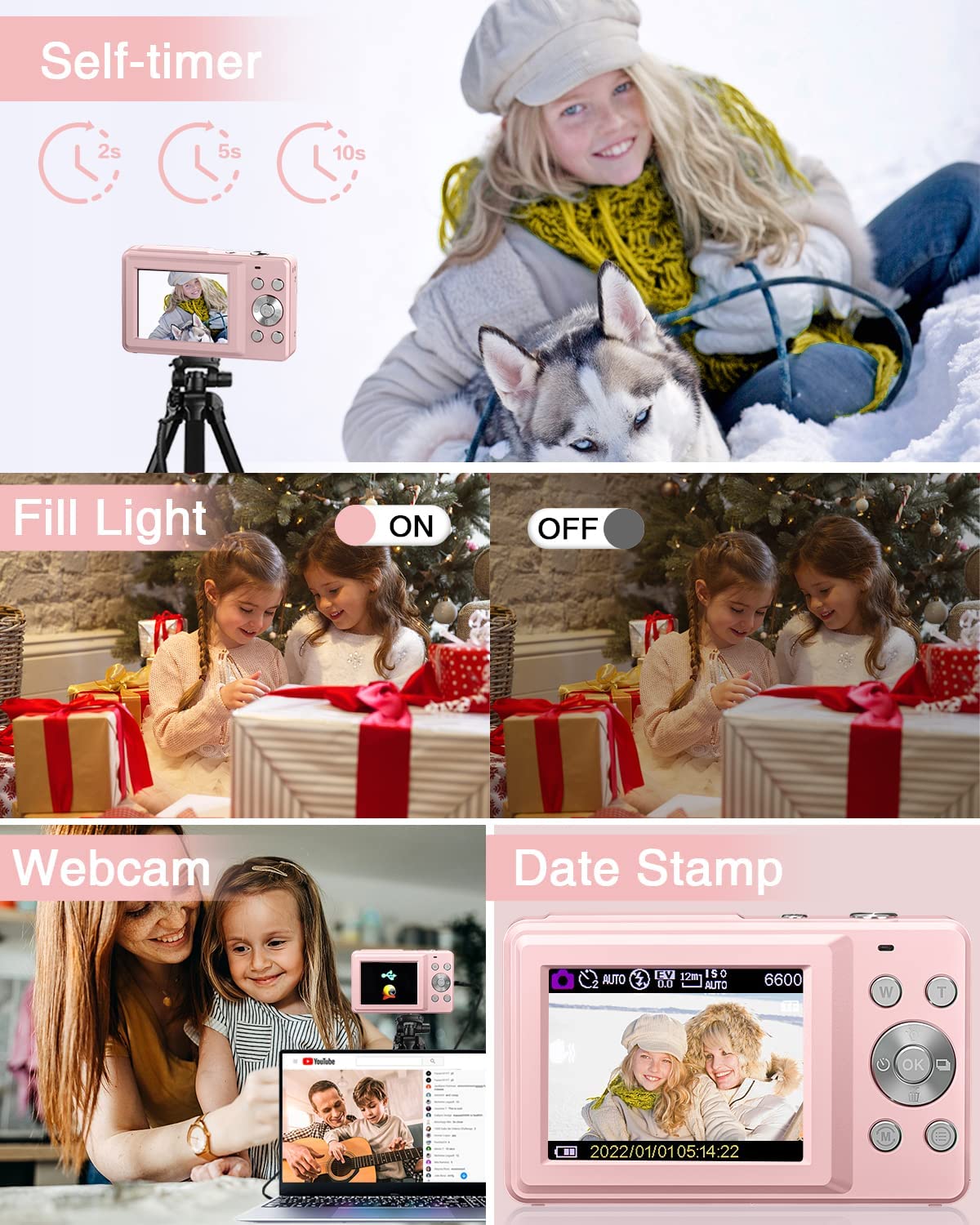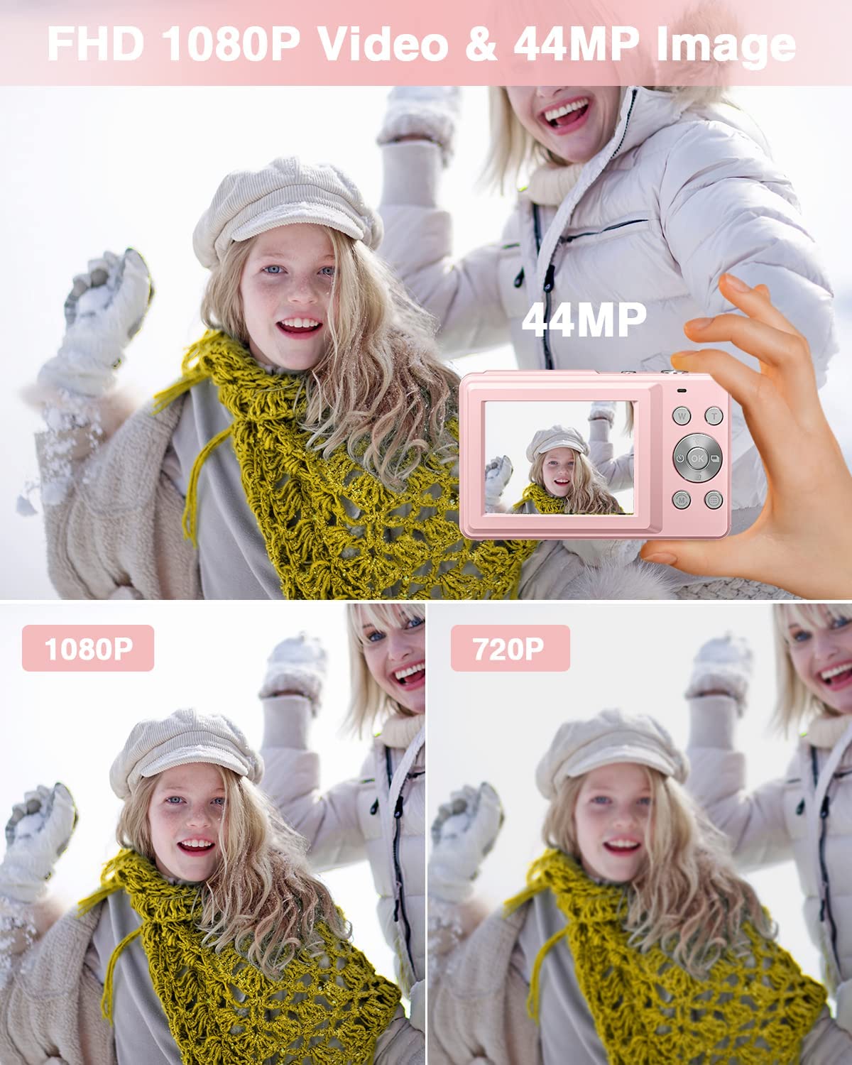 Digital Camera for Kids, Lecran 1080P 44MP Kids Camera with 32GB Card Point and Shoot Camera with 16X Zoom, Compact Portable Cameras Christmas Birthday Gift for Children Kids Teens Girl Boy(Pink)