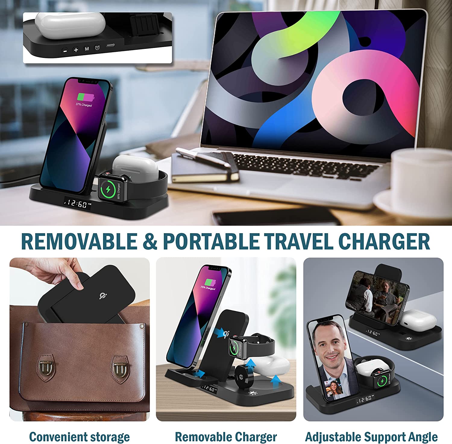 - 3-in-1 fast wireless charger: an integrated charging station for multiple devices. The charging station is compatible with Apple Watch+AirPods+iPhone. The 3-in-1 charging station can be one Apple watch charging station, one mobile phone charging station and one AirPods charging station, and is compatible with 99% of mobile phones that support wireless charging.