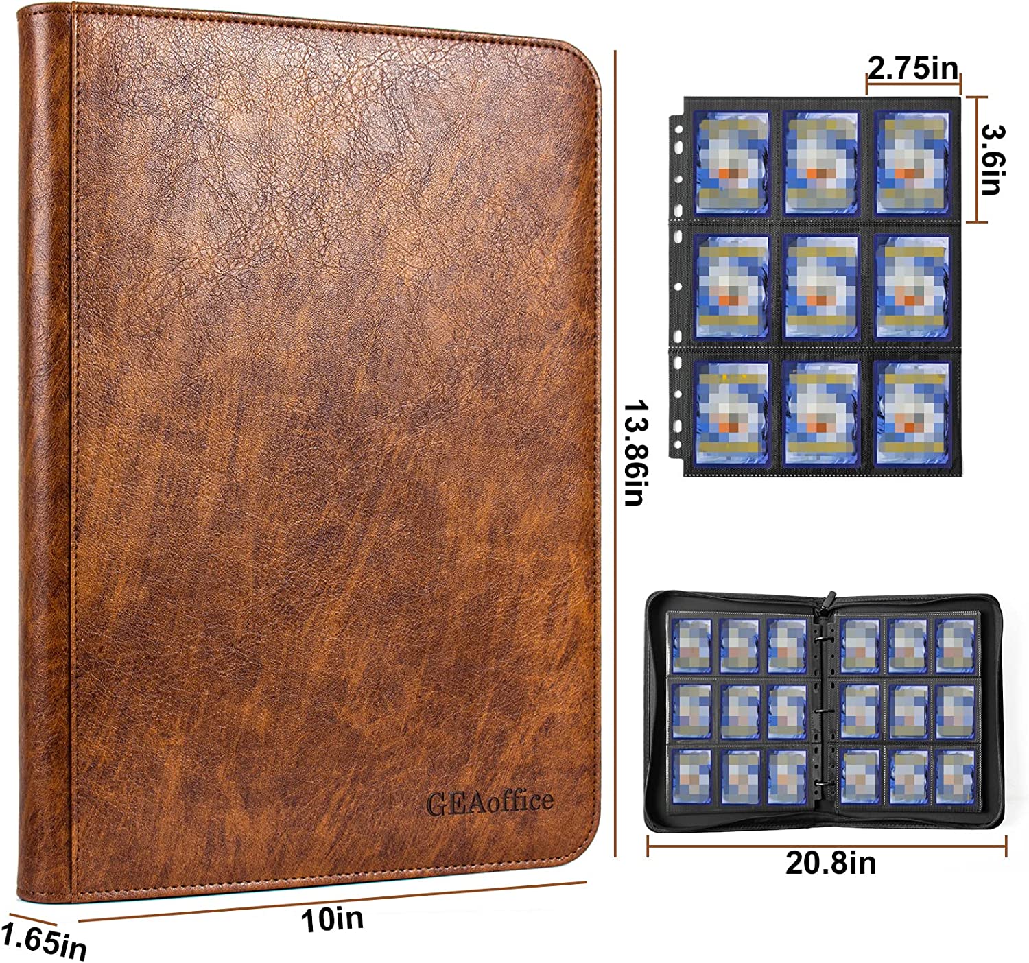 LARGE STORAGE CAPACITY - 9 pocket per page premium quality zip-up trading card binder. With padded, extra rigid front and rear covers made from non-slip, water-resistant PU leather material. 30 pages hold 540 cards. Made from archival-safe, acid-free non-PVC material.