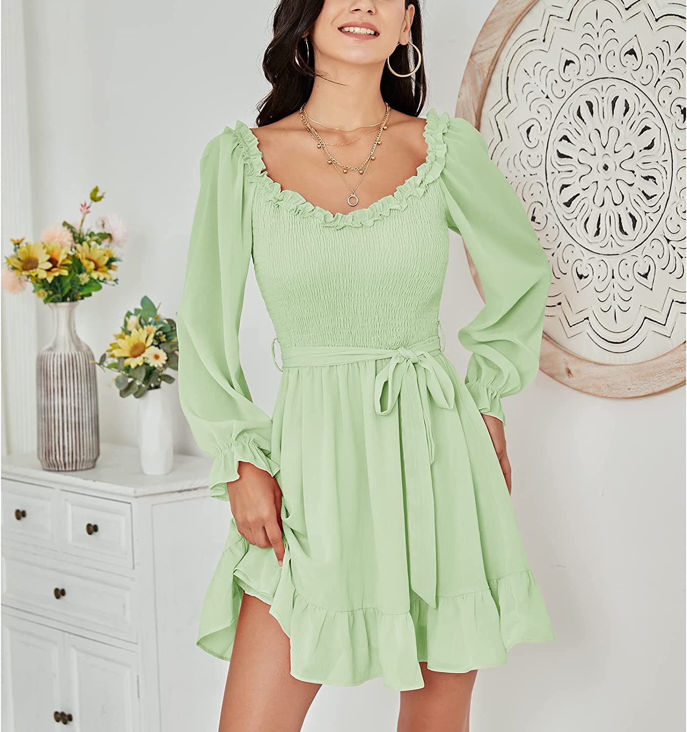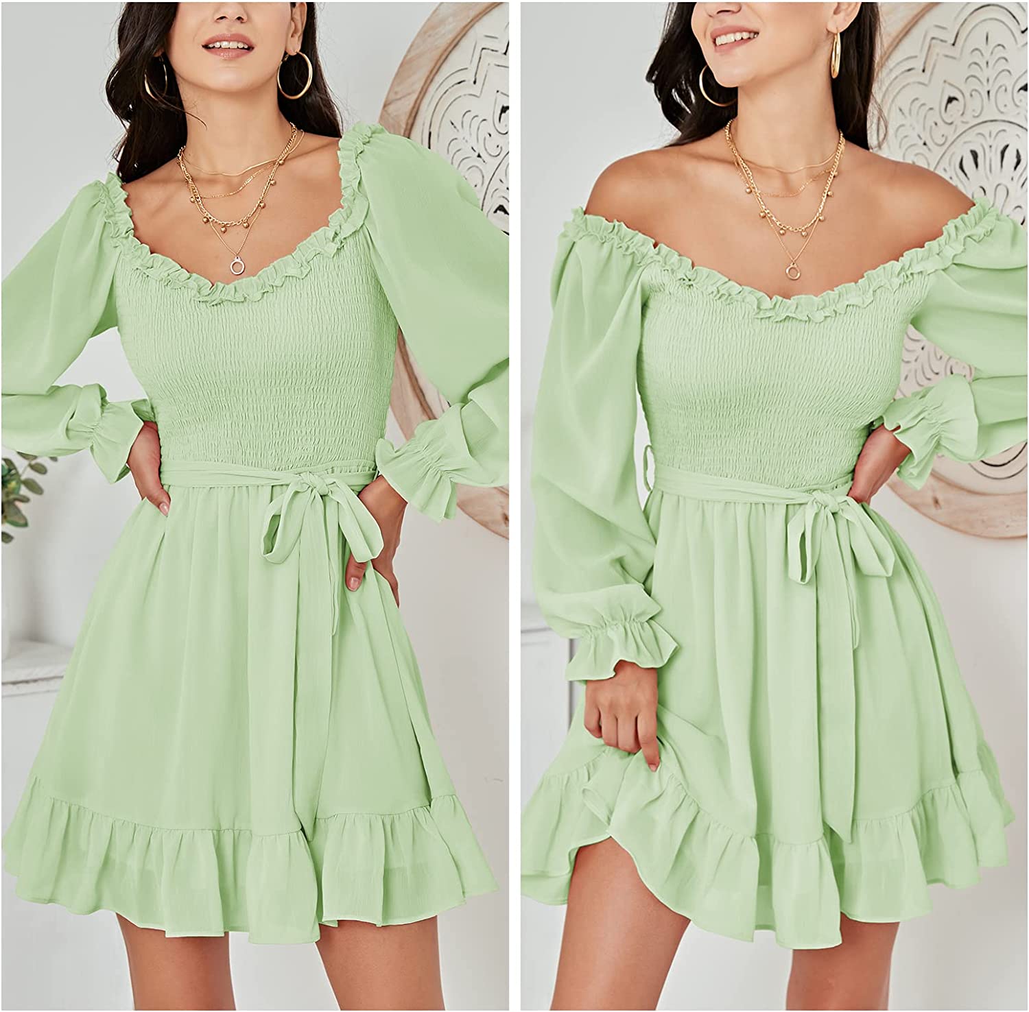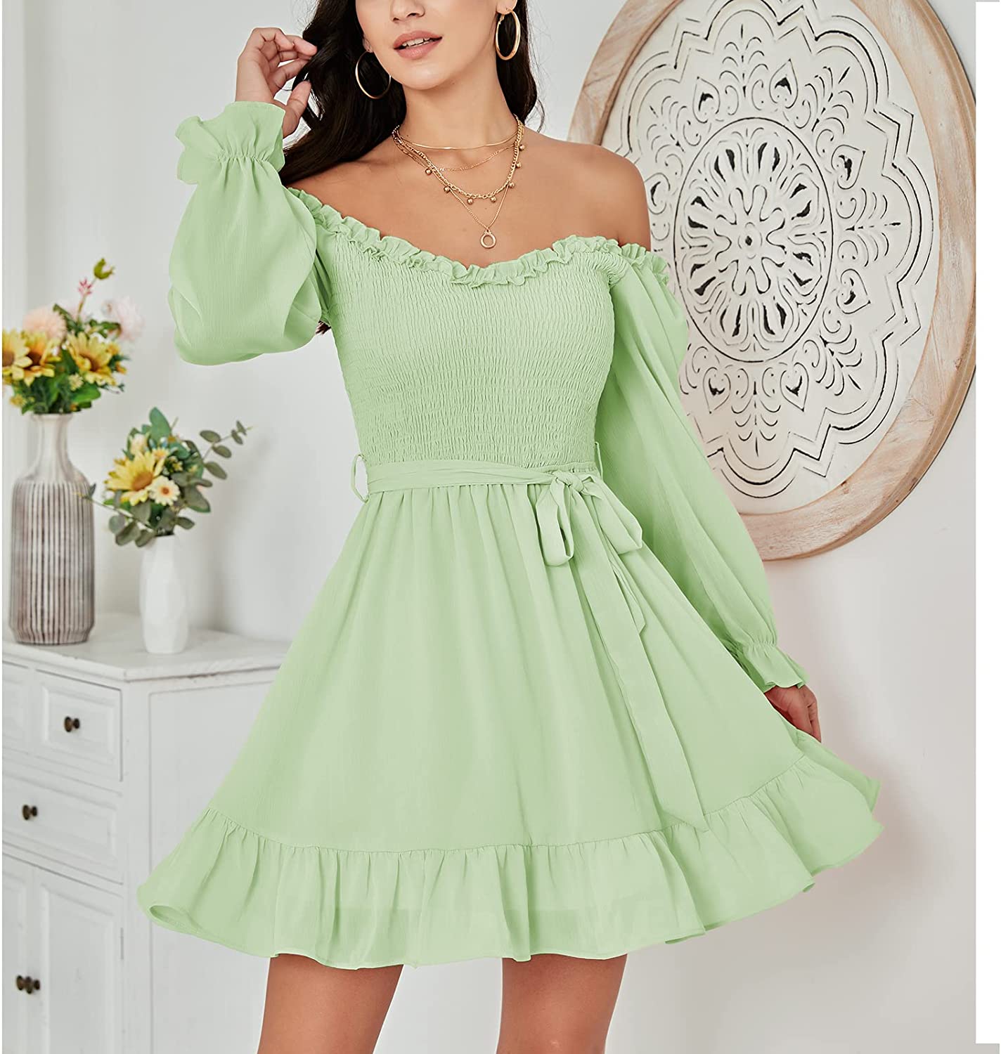 • Feature: long sleeve, ruffle V-neck, off-the-shoulder, smocked bodice, mini dress, waist tie, flowy swing skirt, hight wasit,ruffle hem, prefect for teens wear,go toanywhere like cocktail, party, date night in spring.