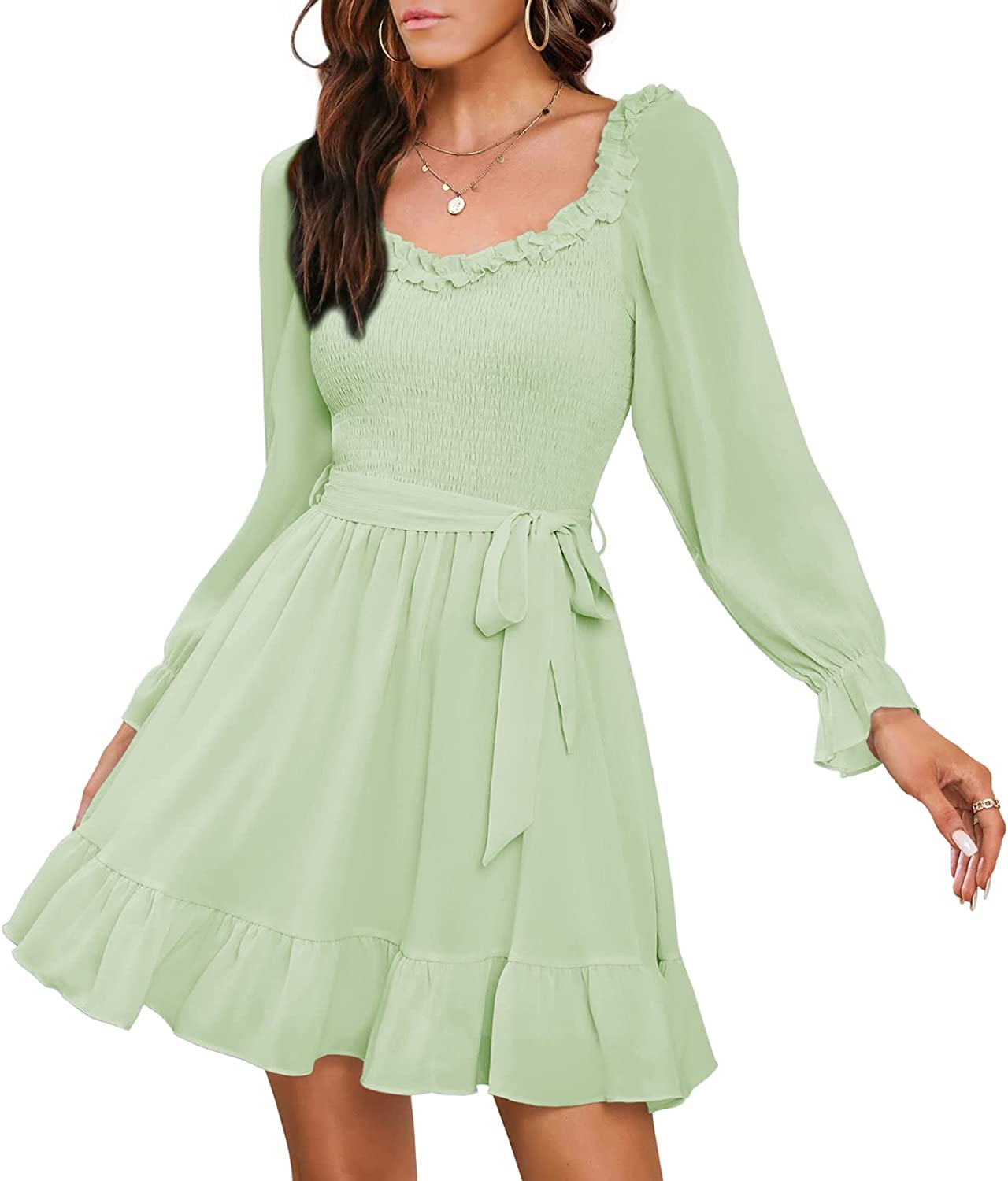 EXLURA Womens Summer Casual Long Puff Sleeve V-Neck Mini Dress Smocked Ruffle Sweetheart Neckline A-line Flowy Dresses