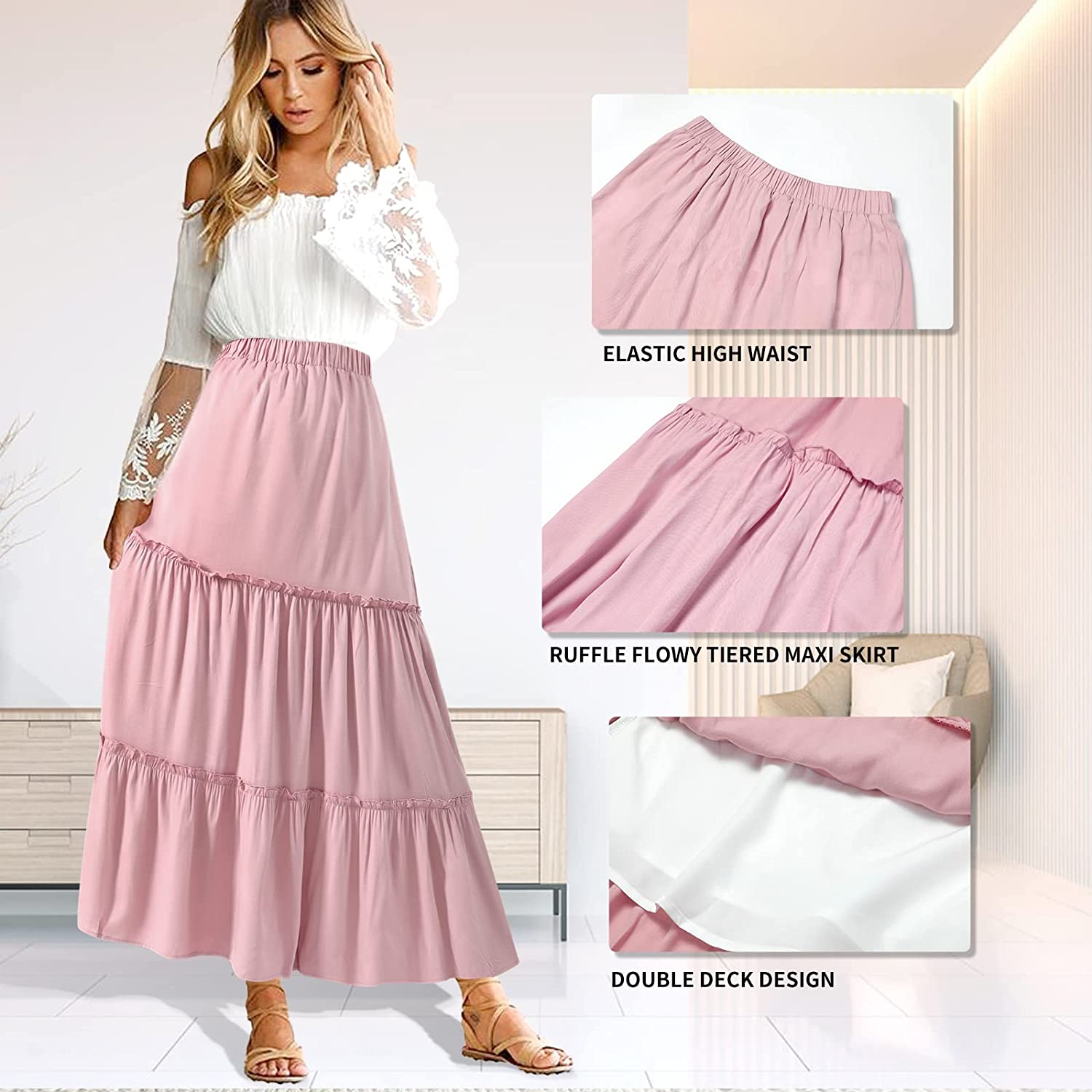 Stylish Design: This classic solid color long maxi skirt is simple but fashion. A-line, ruffle layered, stretchy high waist, bohemian style, floor length, easy dress up or down. No matter what body type you are, this must-have skirt is a good choice for your summer day.