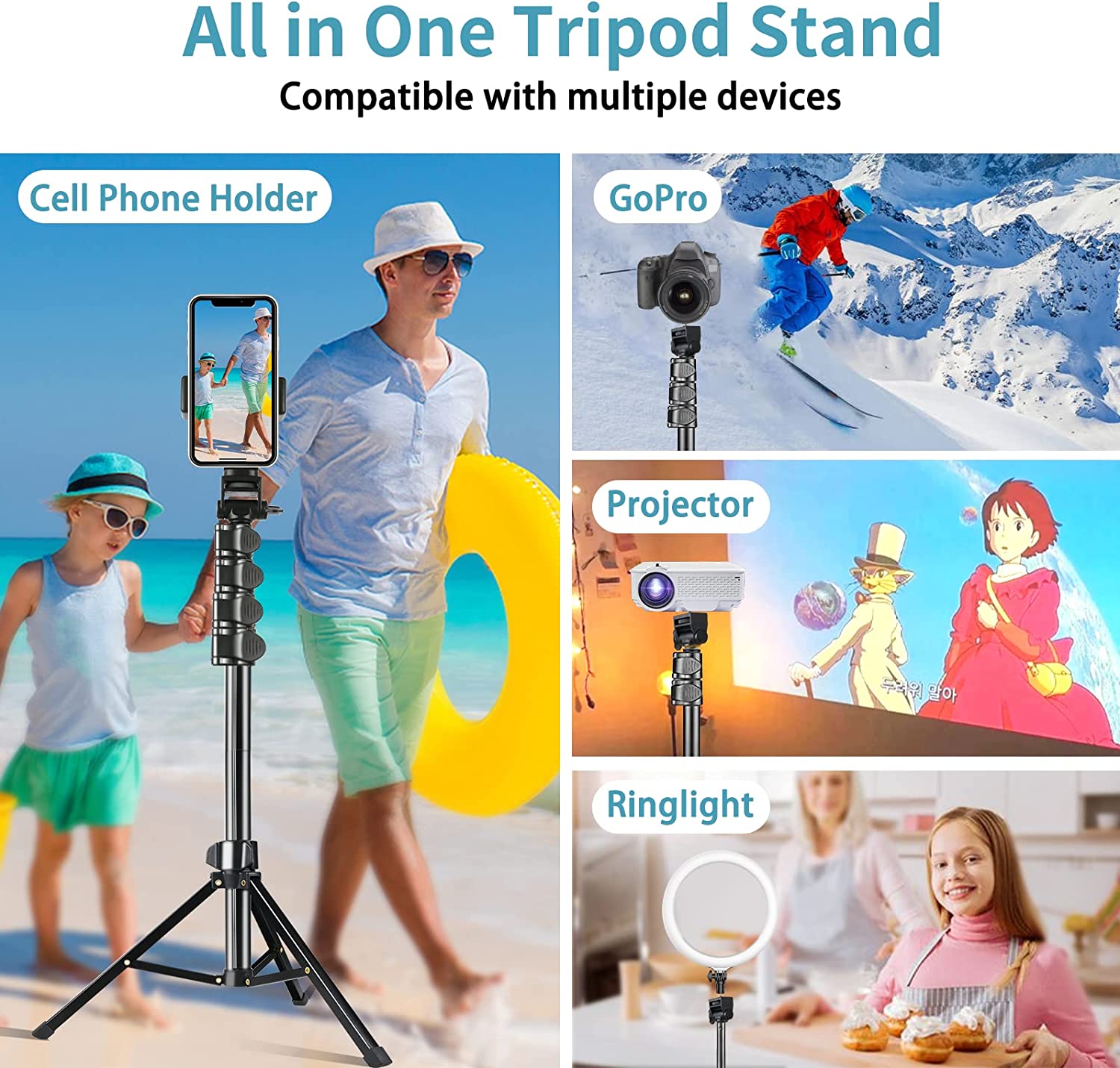 【67'' ADJUSTABLE HEIGHT & PERFECT ANGLE】 Twisting to lock & extendable 67-inch cell phone stands for a Phone or Camera with 4 sections of the telescopic pole that extend from 18.3 '' to 67'' - adjust the shooting angle, allowing you to shoot heights that other 60'' or 62'' cell phone tripod cannot shoot. 180° neck rotation, you are able to adjust the phone/camera holder vertically or horizontally to any angle you want, you can rotate it smoothly, and it allows the phone to take pictures in a vertical position.