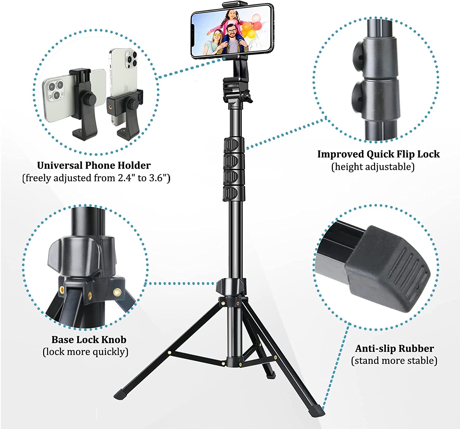 【REINFORCED TRIPOD BASE】The base of the newly upgraded cellphone tripod adopts a reinforced design with a silicone non-slip foot pad-the adjustable tripod is kept incredibly stable on both the floor and a desk. It's very easy to use, just press the button on the bottom to unlock the three legs of the tripod for the phone.