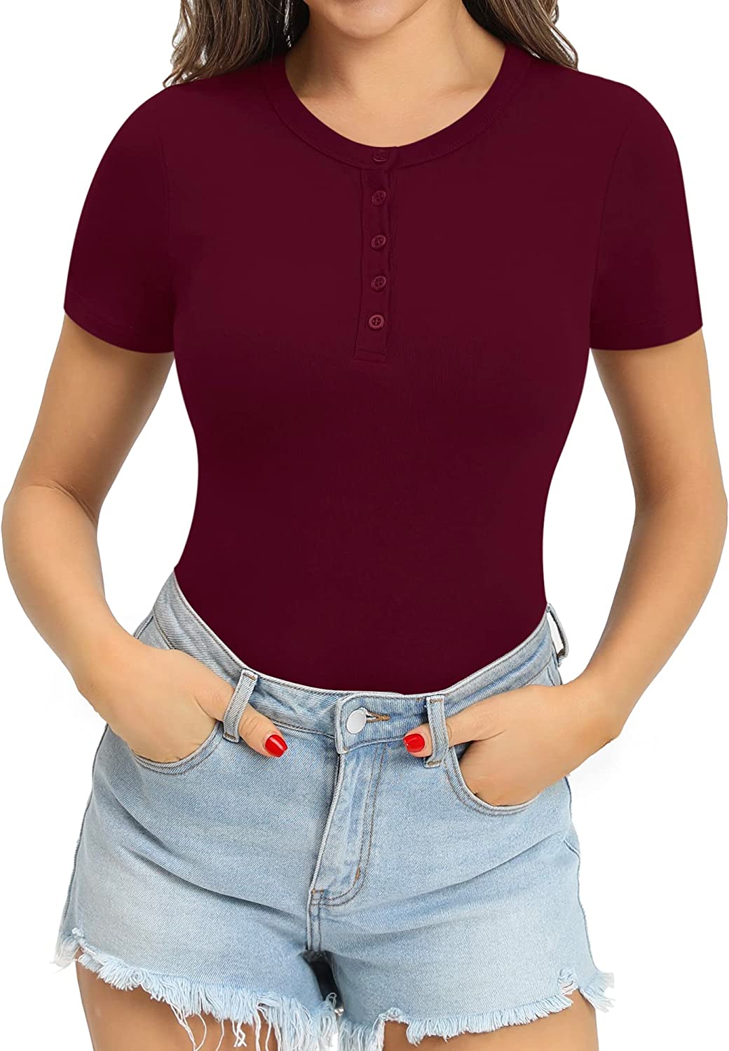 MANGOPOP Women's Round Neck Button Down Short Sleeve Long Sleeve Bodysuit Slim Fit Tops