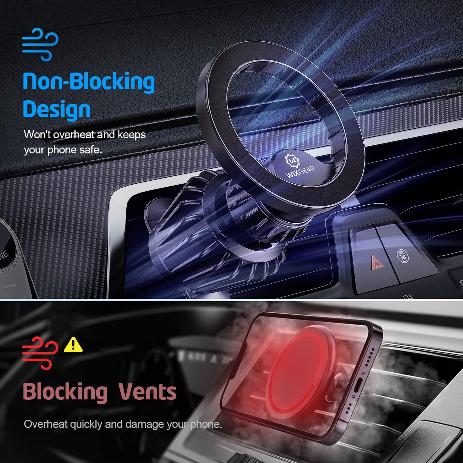 Compact Design: This compatible MagSafe phone mount only takes up a little space and won't block your air vent yet very reliable in securely holding your phone. Compatible with horizontal and vertical vents.