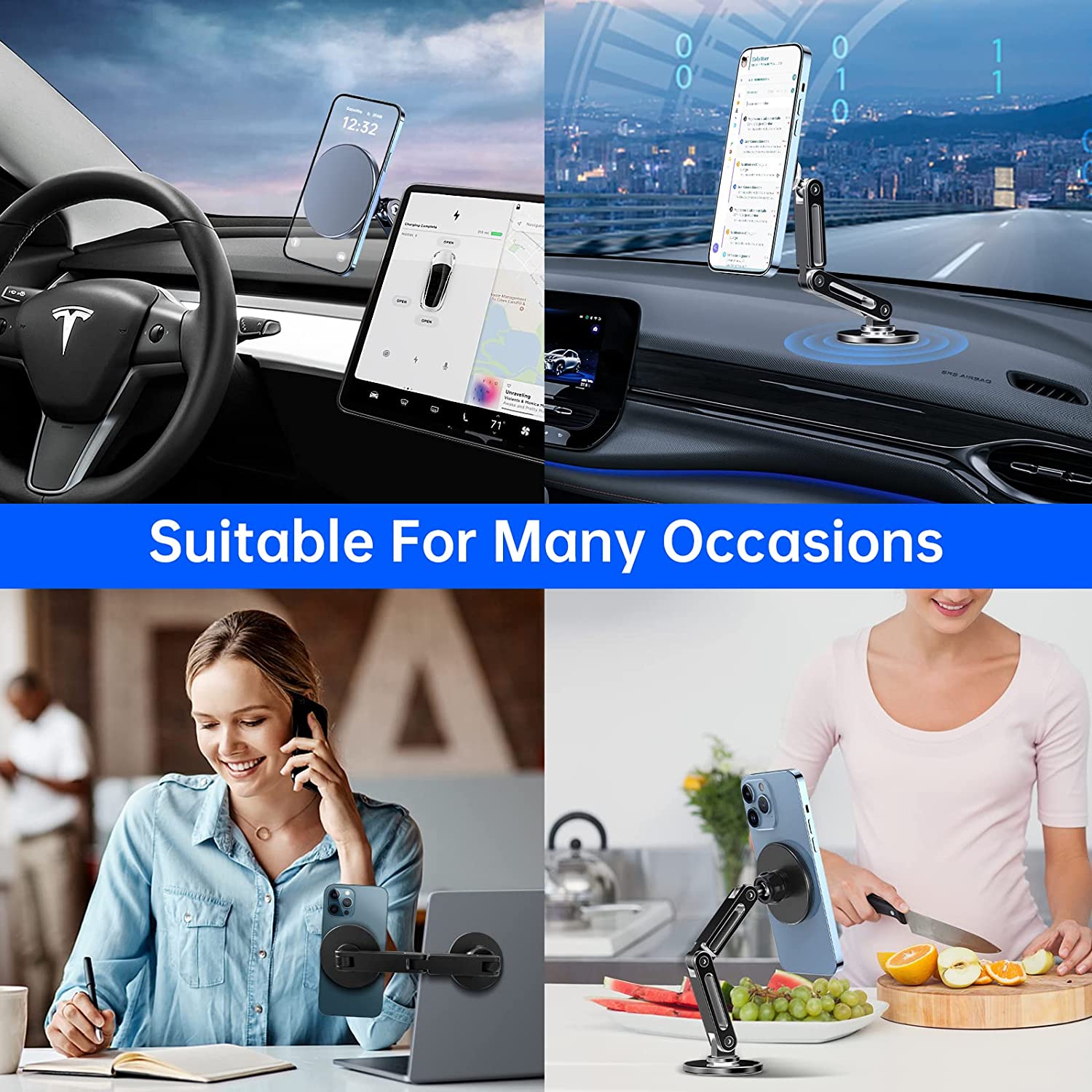 【More Mounting Options】This tesla iphone mount for tesla model 3 accessories and tesla model y accessories, Easy to rotate, Fold and hide, Horizontal and vertical adjustment, Fully adjustable design, 360-degree rotation, Suitable for your multi-angle use, And can be installed on the steering wheel/dashboard Multiple locations behind the panel/center console without obstructing the line of sight for safer navigation.
