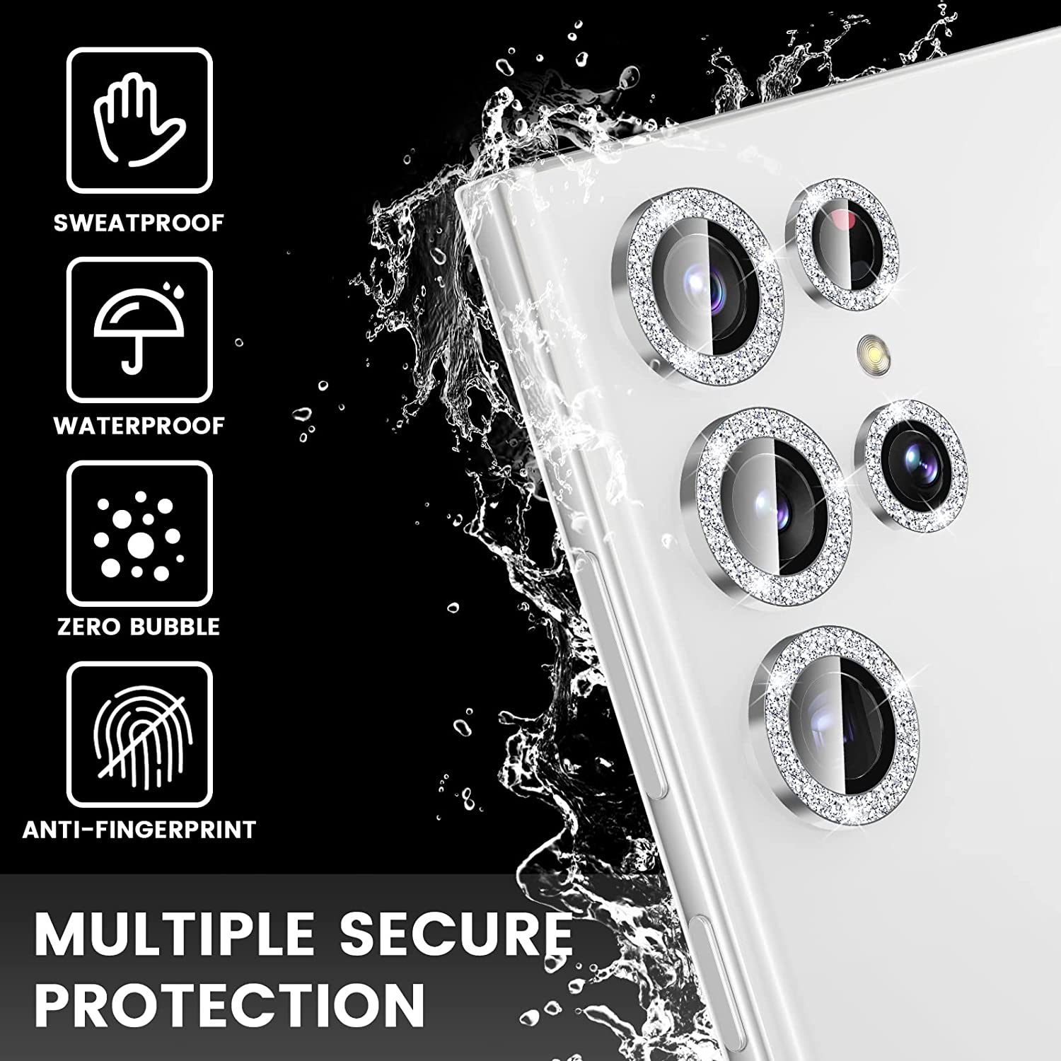 【S23 Ultra Camera Lens Protector】 This S23 Ultra camera lens protector used high-quality aluminum alloy metal and glass screen protector, fully protect your lens, effectively preventing the lens from scratched, dust and bumps. Restore the original color of the phone lens, looks as not installed.