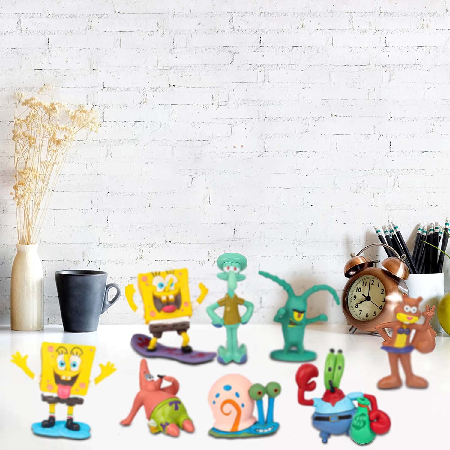 8 piece figurine playset with characters from the hit tv show... Spongebob Squarepants! These are great for cake toppers to decorate a cake, to give as birthday party favors, or to use as toys to play with! These are genuine toys. No retail box or retail packaging. All characters are individually wrapped in clear bags and sealed together in a clear OPP/CPP bag. Toys may have slight imperfections but doesn't affect overall appearance. We will ship in a box to ensure safe delivery! SUPER CUTE!! This Set includes: Spongebob - 2 inches Spondebob (surfing) - 2 inches Patrick Star - 1.5 inches Squidward - 2.5 inches Mr. Krabs - 2.25 inches Sandy Cheeks - 2.25 inches Gary - 1.5 inches Plankton - 2 inches