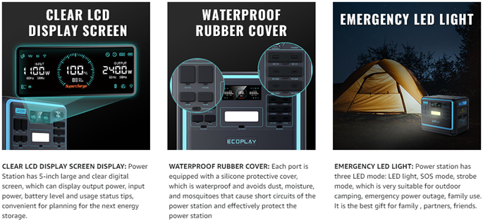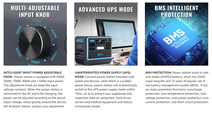 - 【 INTELLIGENT INPUT SETTING KNOB】Ecoplay portable power station has adjustment input power knob, include 300W, 500W, 700W, 900W and 1100W input power. You can adjust the charging time of the AC charger effectively and flexibly control the time. It can be adjusted not only by adjusting the device according to the input power but also by preventing the device from being damaged by voltage instability.