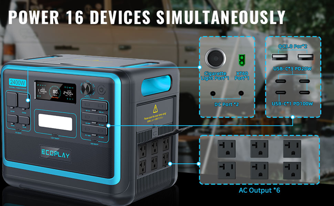 - 【POWER 16 DEVICES SIMULTANEOUSLY】The portable power station can charge 16 devices at the same time. it features with 6* AC Outlets (2400W power, 110V/50Hz-60Hz pure sine wave), 2*DC Outputs (12V/3A), 1*XT-60 Output(12V/25A), 1*Car Charging Output(12V/10A), 2* USB-A QC3.0 Port (5-12V 18W fast charging), 3* USB-C Port (5-20V/ 20W), 1* USB-C Port (5-20V/ 100W Max). 1 * Anderson Input, Car Charger Input. Compatible with more than 99% of electrical devices.
