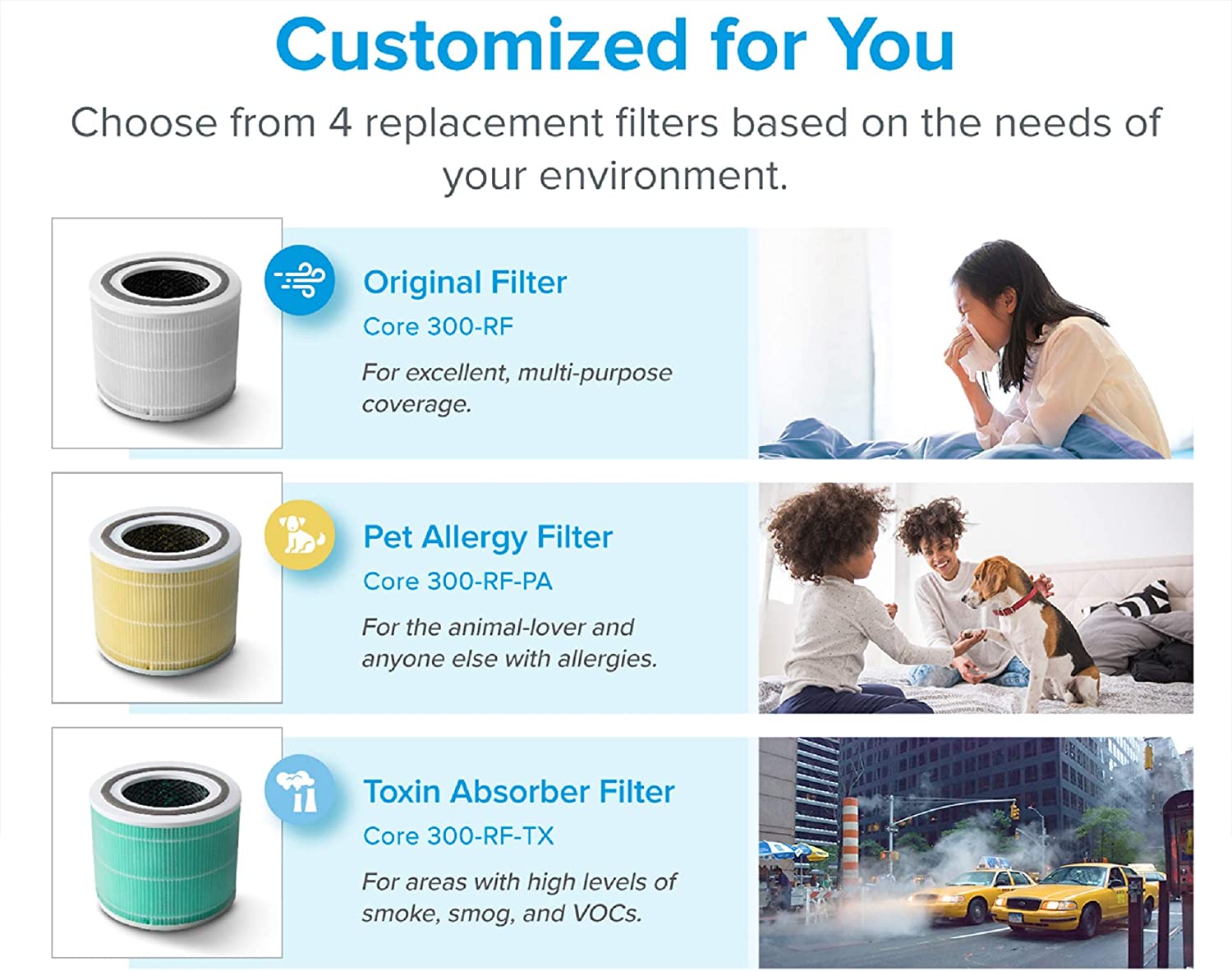 - MULTIPLE FILTER CHOICES: Choose from a variety of replacement filters to best meet your needs. The Toxin Absorber Filter specializes in smog, toxins and VOCs. The Smoke Remover filter specializes in wildfire, smoke and etc. And the Pet Allergy Filter helps to capture pet dander and absorb unpleasant odors