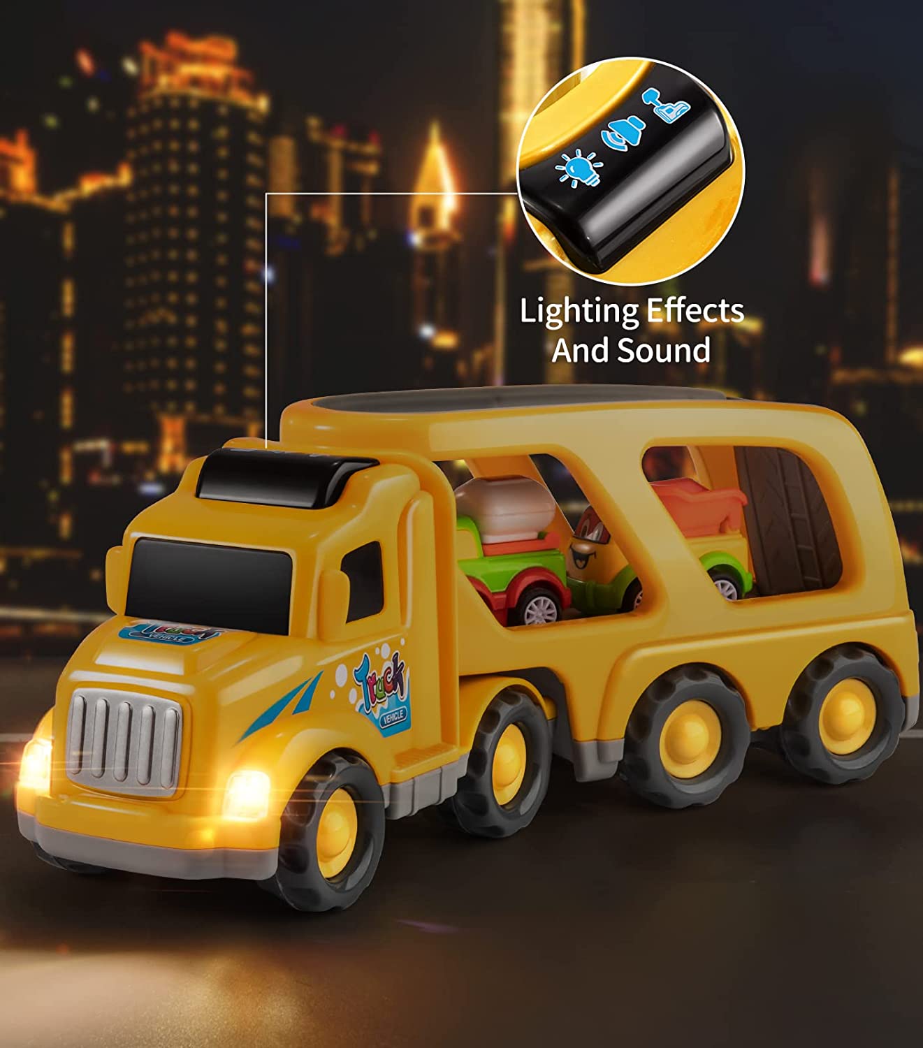 • Friction & Turnable & Removable: Just push and let it go,the hauler truck will carry four small engineering vehicles and set off! The head of the big carrier can also turn. After reaching, separate the cab and the traction compartment, and then open the tailgate to transport vehicles down. Pull the small vehicle back, the force of return allows them drive fast to start a construction job! Easy to play toys for baby.