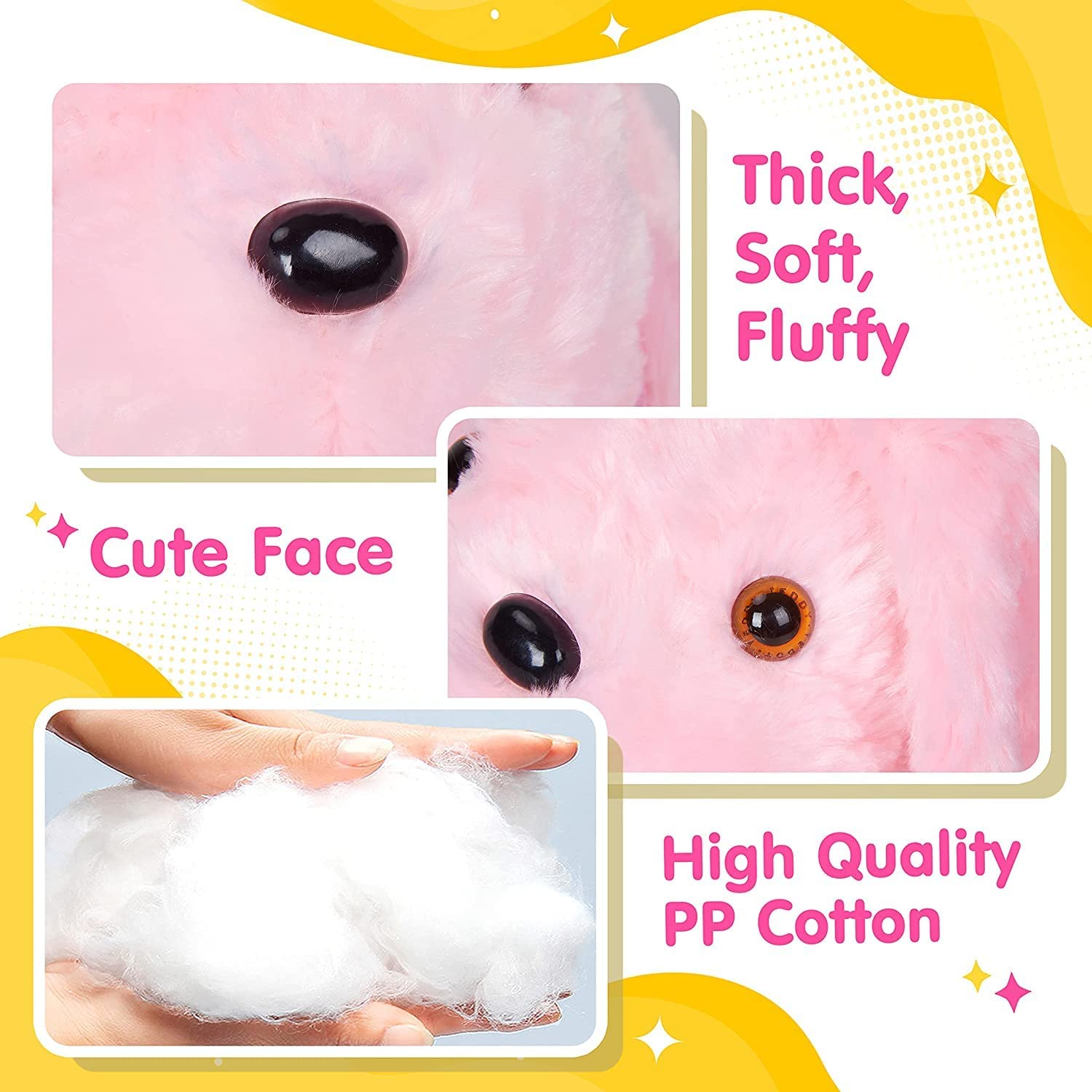 • SOFT SQUISHY MATERIAL---Stuffed with soft plush of high quality 100% PP cotton, all the plush dog is using environmental friendly materials. Safe and soft for children to hug. The Dog’s eyes on the stuffed animal puppy is tightly stitched, and we used the velcro tape on the back of the dog, in case the traditional zipper may hurt kids. NOTICE: Please keep it away from water and fire.
