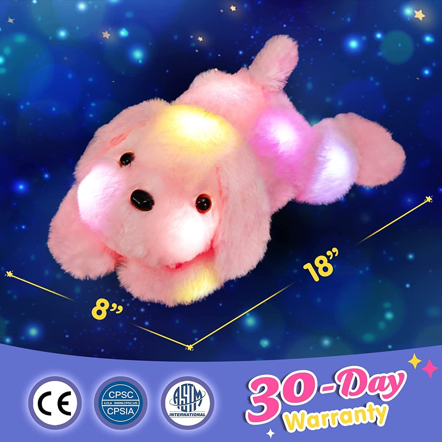 • ADORABLE IMAGE OF PUPPY---This pink LED dog stuffed animal features a quiet crouching dog. Quite a lot of people are living with dogs, however, to those who loves dog but are allergic to the fur or kids who are too little to hug a four-leg friend with paws and fangs, this glow soft plush toy dog may be a good alternative.