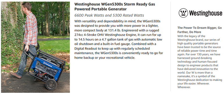 The Westinghouse WGen5300s is a versatile solution for all your power needs from your home to your RV when you’re looking for a dependable backup power supply. The WGen5300s produces 6,600 peak watts and 5,300 running watts with a powerful 274cc 4-Stroke OHV Westinghouse Engine constructed for durability. Running for up to 14.5 hours on a 4.7 gal. (18L) tank of gas, it's conveniently equipped with a built-in fuel gauge, automatic low oil shutdown, and electric start with manual choke. The L14-30R outlet is Transfer Switch Ready to supply total household power which eliminates the hassle of annoying extension cords or power strips. Combined with an RV Ready TT-30R outlet, you can ensure your recreation vehicle or home is ready to go for air conditioners, refrigerators, sump pumps, and home necessities. The intuitive control panel includes the Digital Readout to share real-time updates on maintenance information and a 120/240 Volt Selector Switch to draw more power with added flexibility for appliances like a well pump. Engineered into a compact hardened-steel frame with never-flat wheels, it's easy to bring this generator from storage to use. The WGen5300s Portable Generator is complete with a 3-Year limited service, labor, and parts coverage with Lifetime Technical Support to ensure your confidence can be backed by our nationwide customer service and support network.