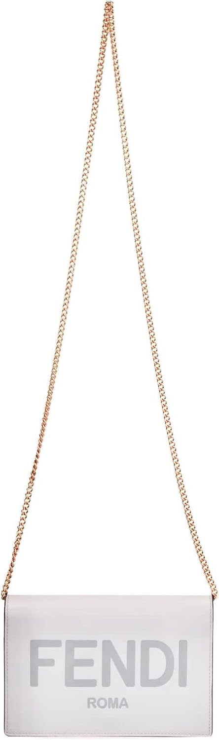 The Fendi Roma Ghiaia Wallet on Chain is beautiful and luxurious. The off-white soft leather is enhanced by the bold Fendi logo across the front. Carry by hand or over the shoulder by a delicate gold chain. Flap opening reveals a main compartment with credit card slots and a zippered pouch. Items stay secure with a snap closure. A beautiful white handbag perfect for everyday, weddings, an evening out and more. This timeless piece will bring joy for years to come.