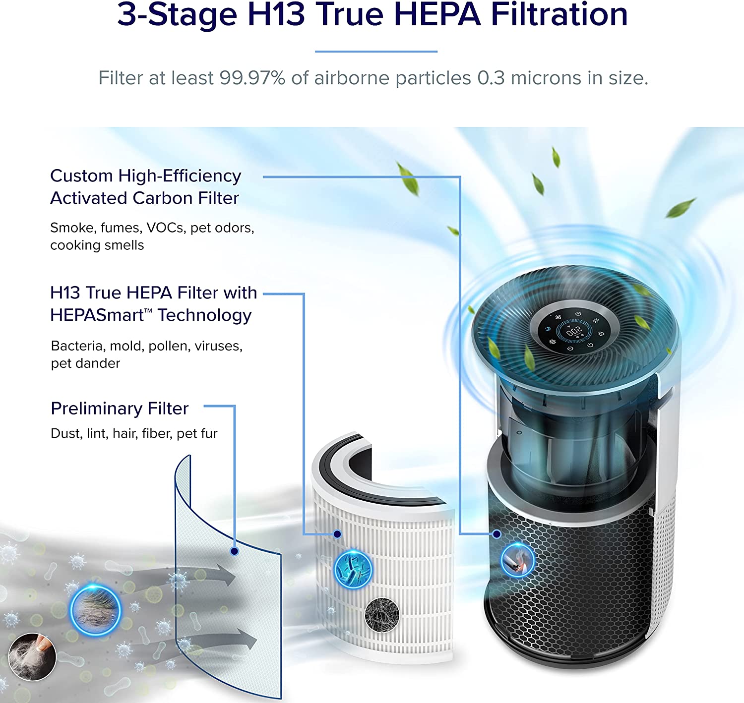 - 3-STAGE FILTRATION: Filtration includes a Pre-Filter, H13 True HEPA Filter, which traps viruses, bacteria, pollen,dust, and pet dander, and a Custom High-Efficiency Activated Carbon Filter that helps neutralize odors, cooking and wildfire smoke, and VOCs
