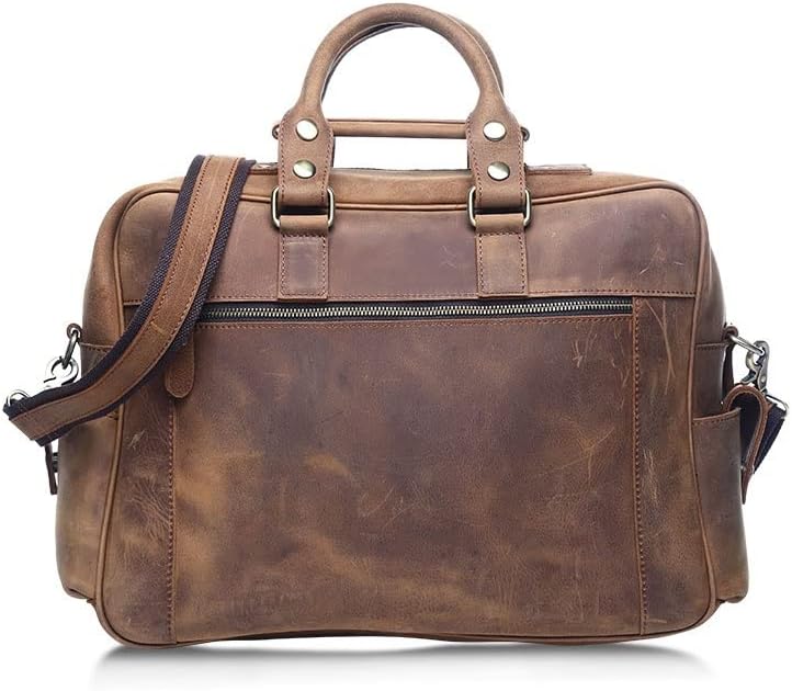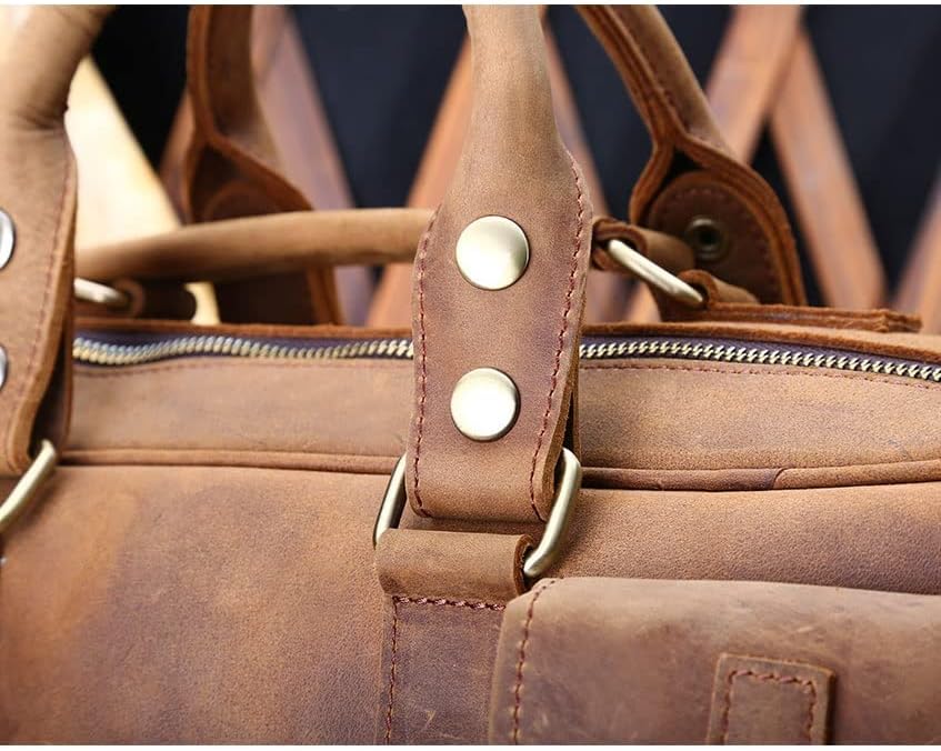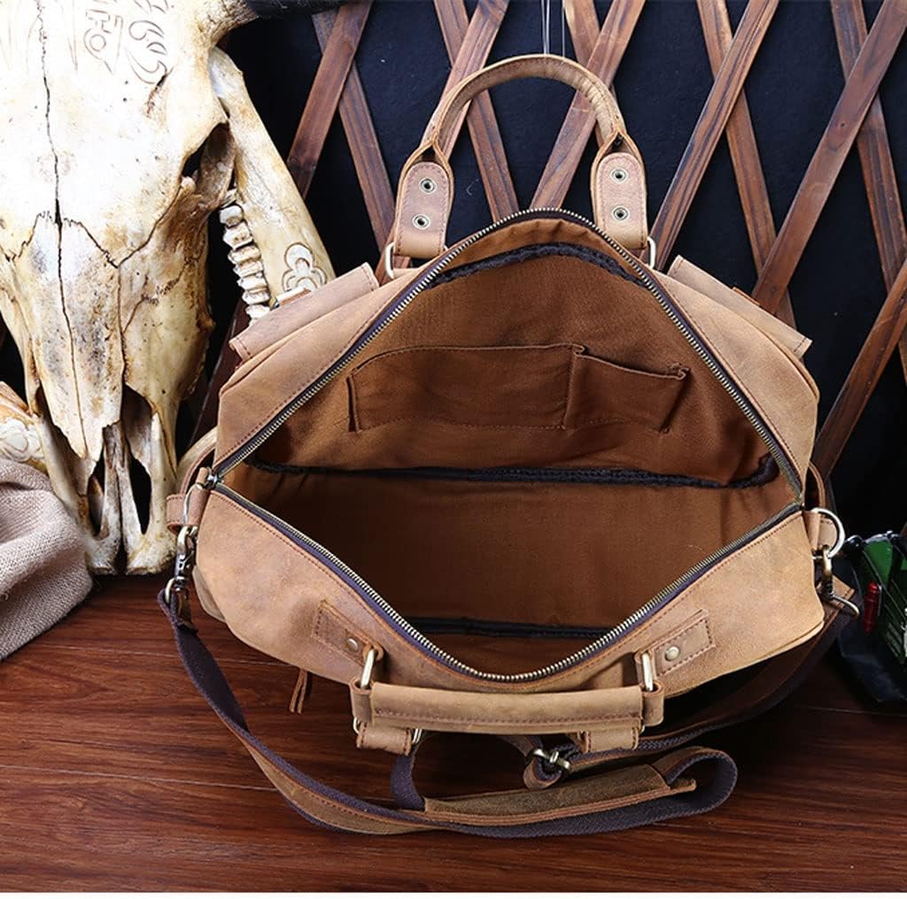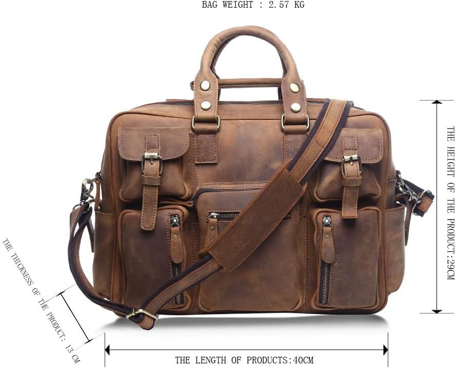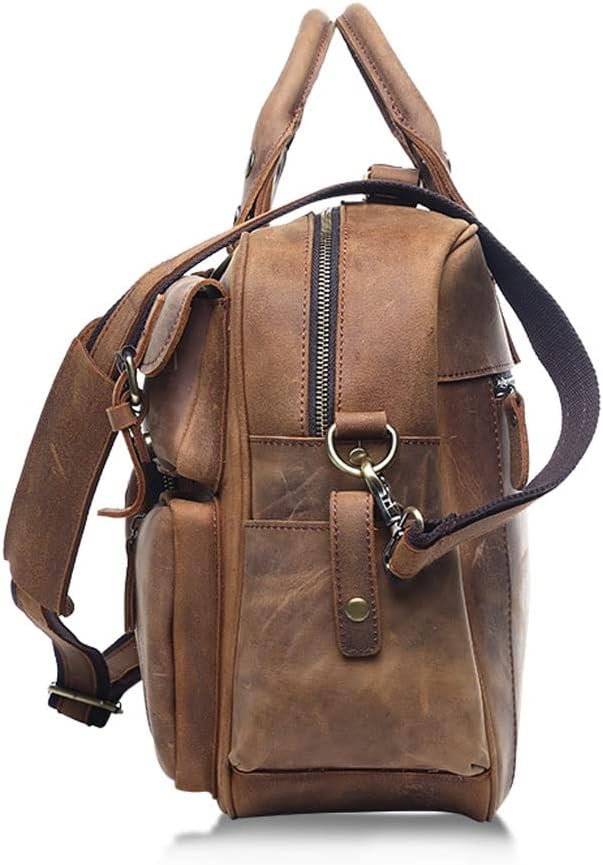 DLOETT Large Men's Crazy Horse Leather Tote Bag Several Pockets Bag Men's Shoulder Bag